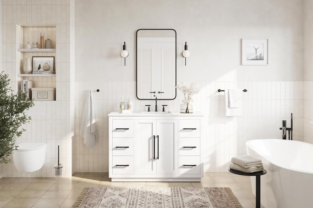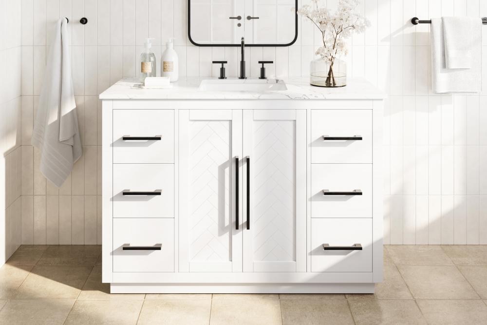 Each finish enhances the unique herringbone design on the Shaker-style door panels, adding a touch of craftsmanship and texture that elevates the overall design of the vanity.