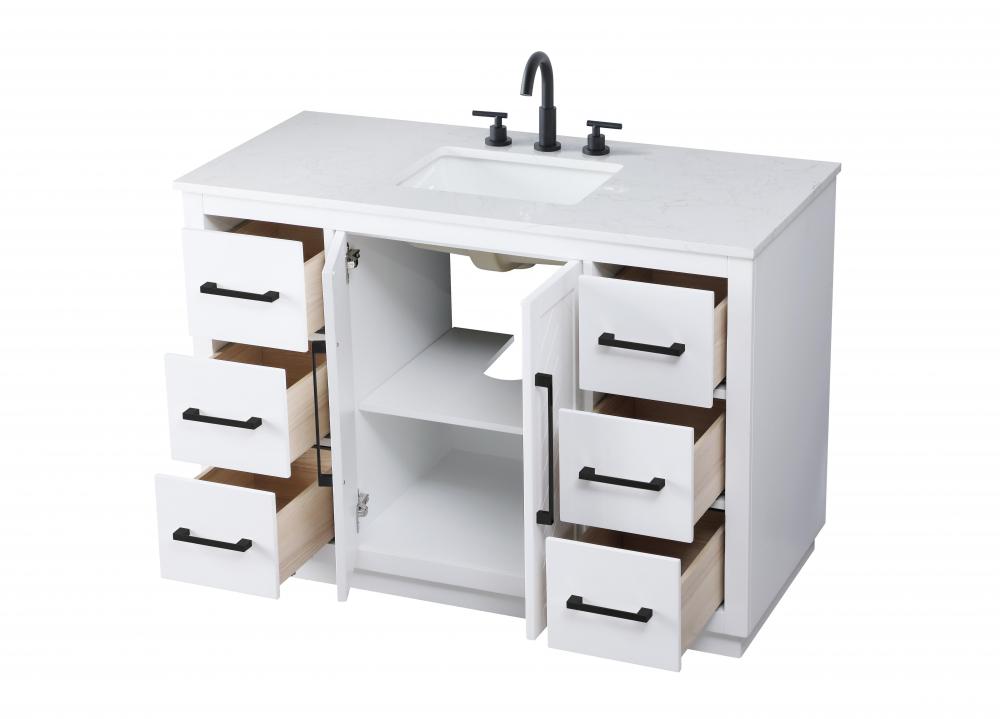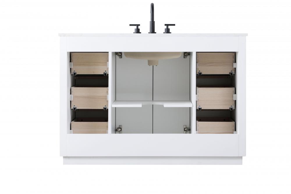 The vanity is topped with a white engineered marble countertop featuring subtle, natural-looking veining that creates a luxurious yet low-maintenance surface. This countertop adds elegance while providing durability, making it ideal for everyday use.