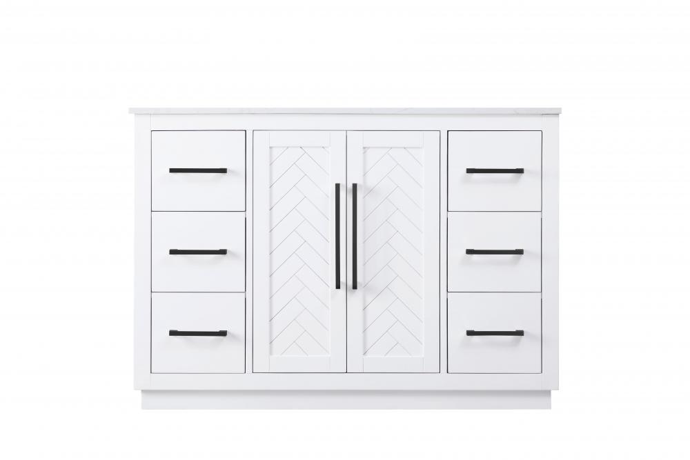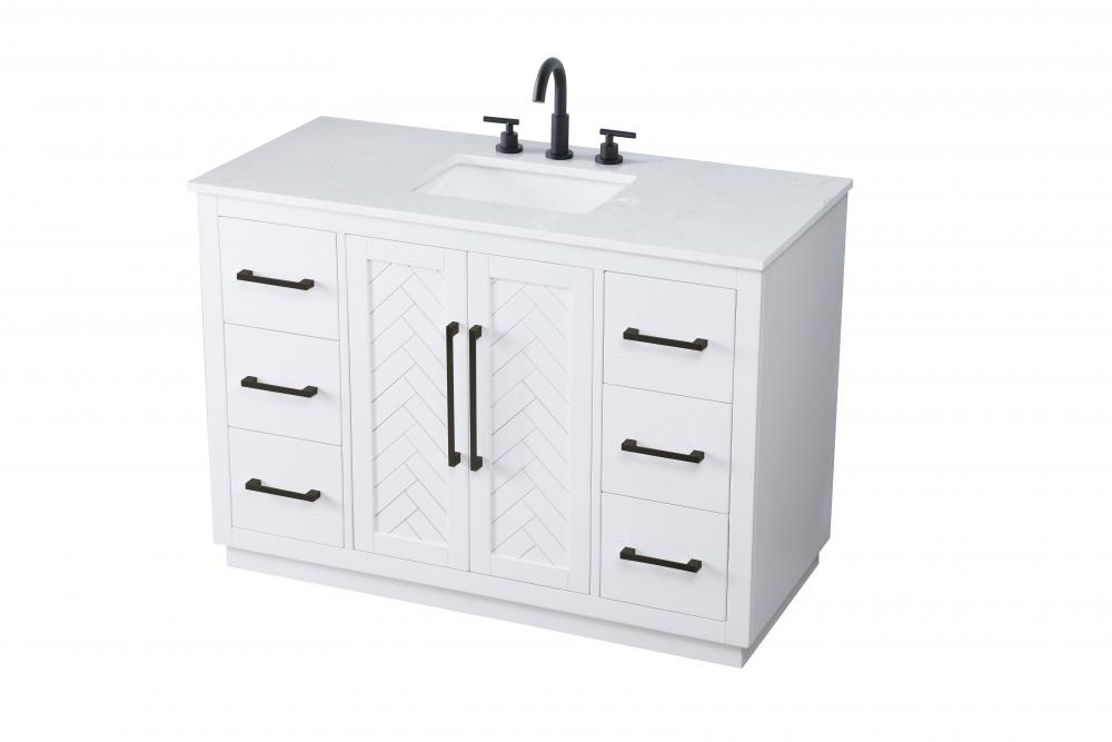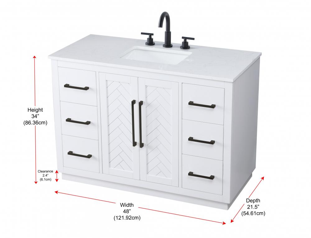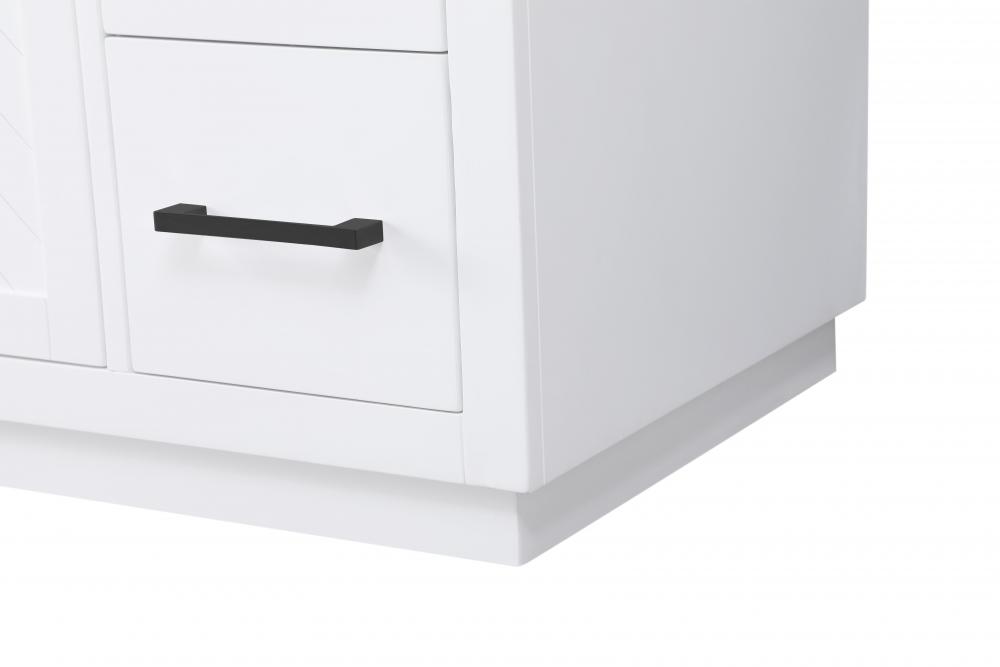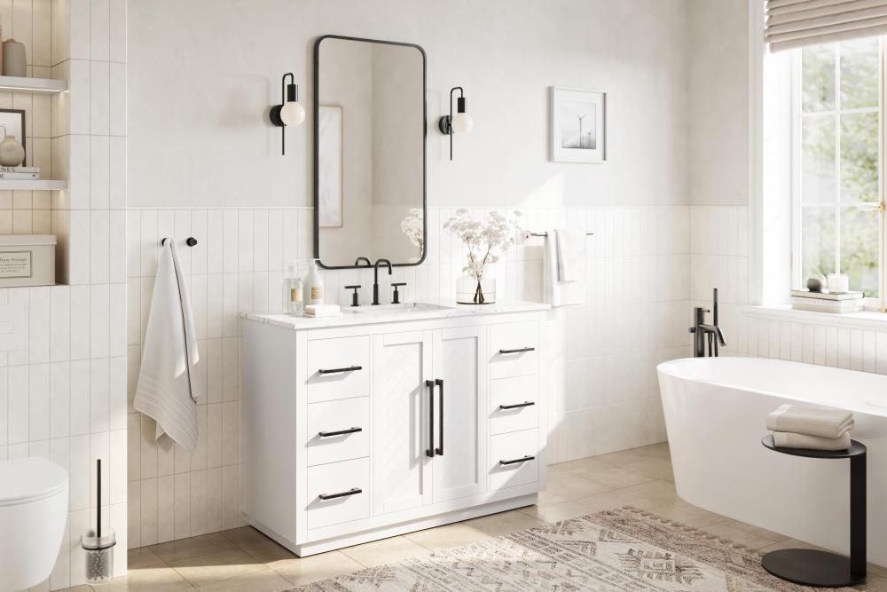 This transitional bathroom vanity offers the perfect blend of timeless style and modern functionality. Available in five refined finishes—crisp white, sleek grey, chocolate oak, honey oak, and linen oak—it complements a range of decor styles, from classic to contemporary. The stunning herringbone design on the Shaker-style door panels adds texture and craftsmanship to the piece. Topped with a white engineered marble countertop featuring subtle veining, it provides both beauty and durability. The long black metal pulls on the soft-closing doors and the thin bar pulls on the drawers add sleek, modern detailing. Practical features include a concealed overflow, a back panel cutout for easy plumbing installation, and a U-shaped cutout shelf to fit plumbing while maximizing storage space. with a toe kick all around the base, this vanity is thoughtfully designed to blend form and function in any bathroom setting.