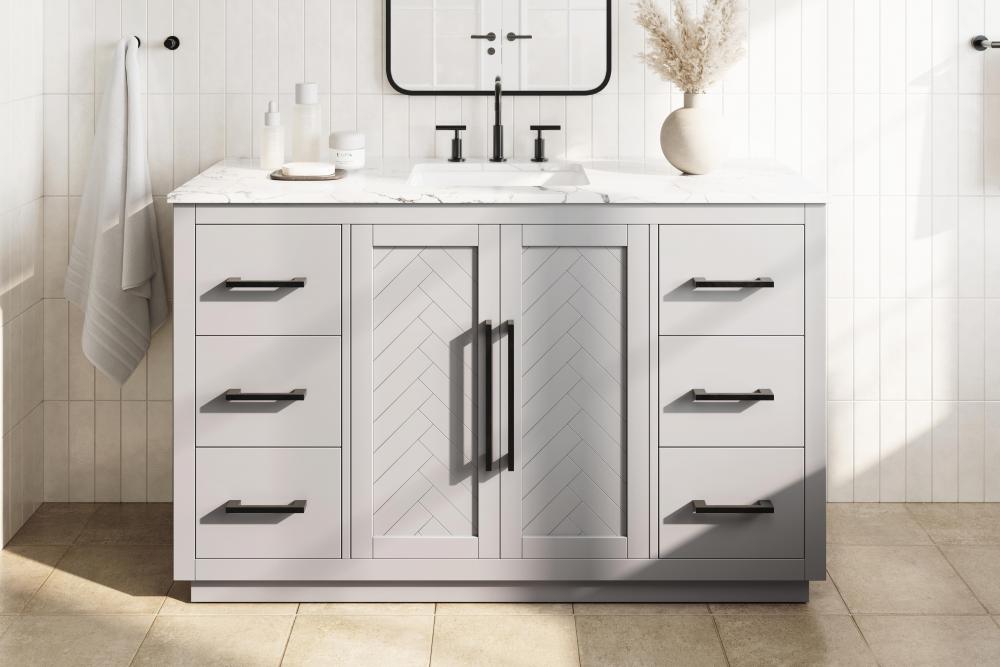 Each finish enhances the unique herringbone design on the Shaker-style door panels, adding a touch of craftsmanship and texture that elevates the overall design of the vanity.