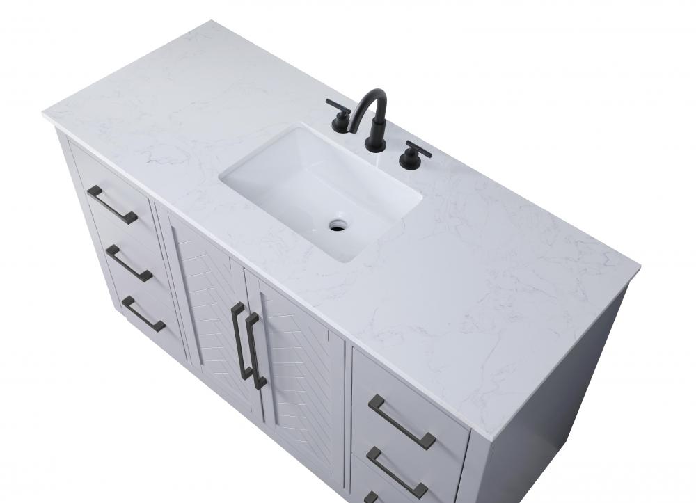 The vanity is topped with a white engineered marble countertop featuring subtle, natural-looking veining that creates a luxurious yet low-maintenance surface. This countertop adds elegance while providing durability, making it ideal for everyday use.