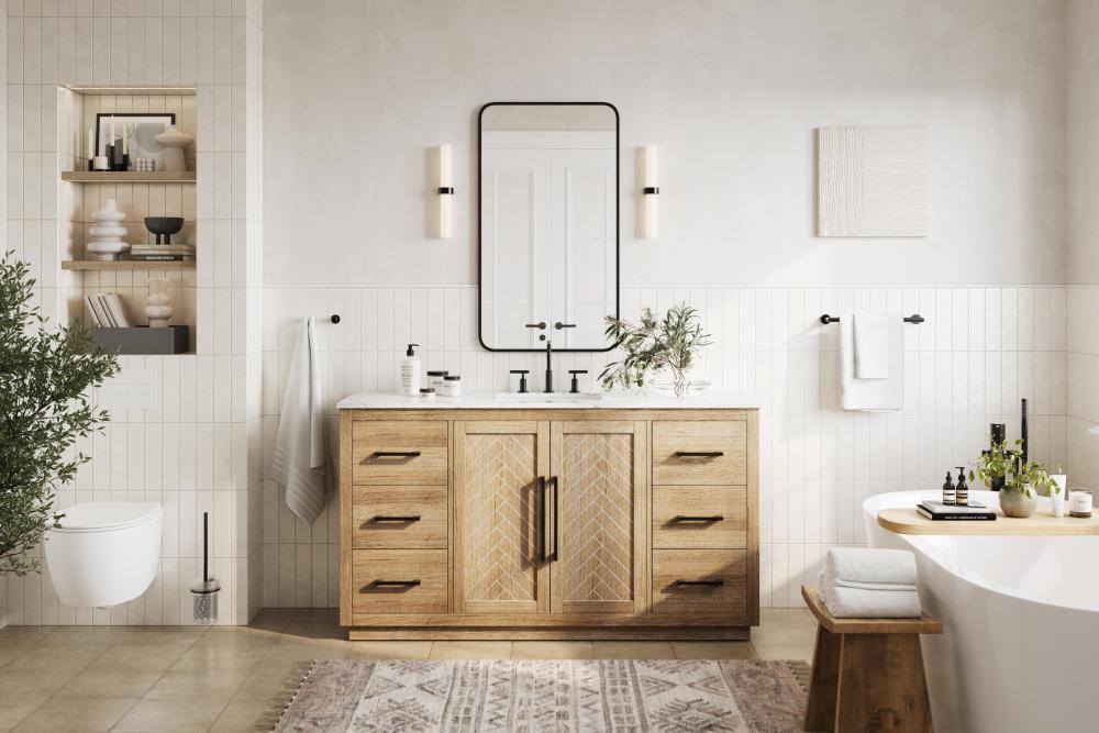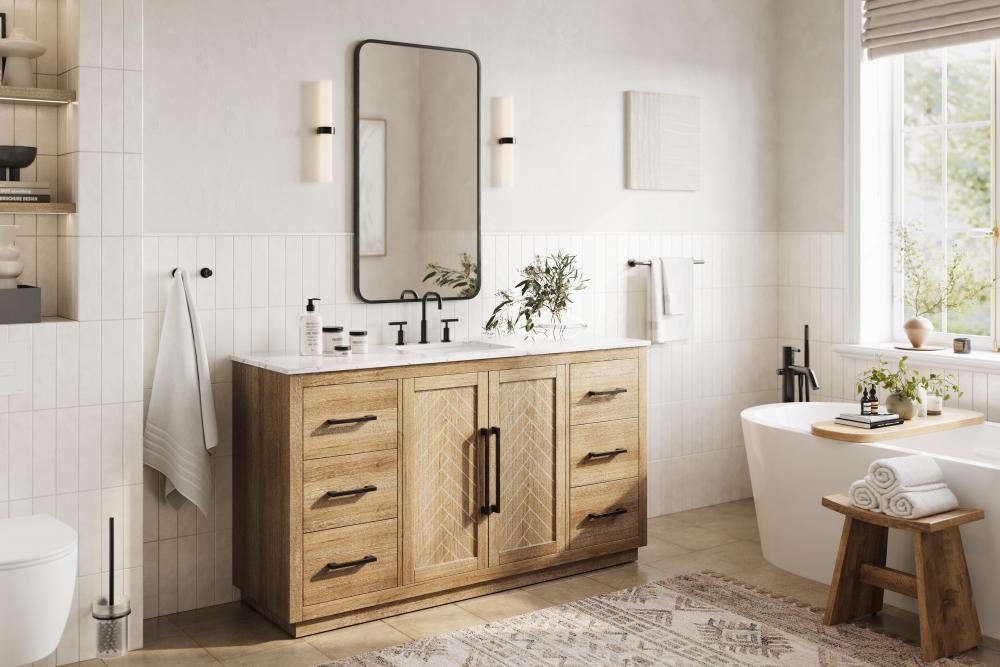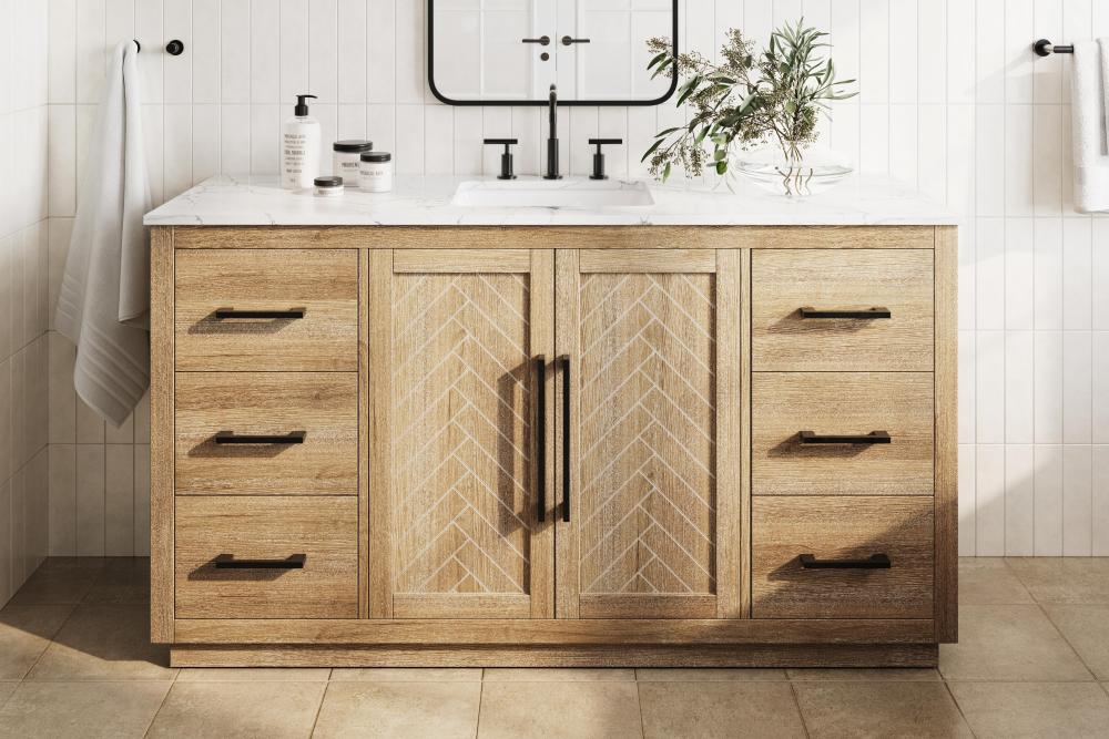 Each finish enhances the unique herringbone design on the Shaker-style door panels, adding a touch of craftsmanship and texture that elevates the overall design of the vanity.
