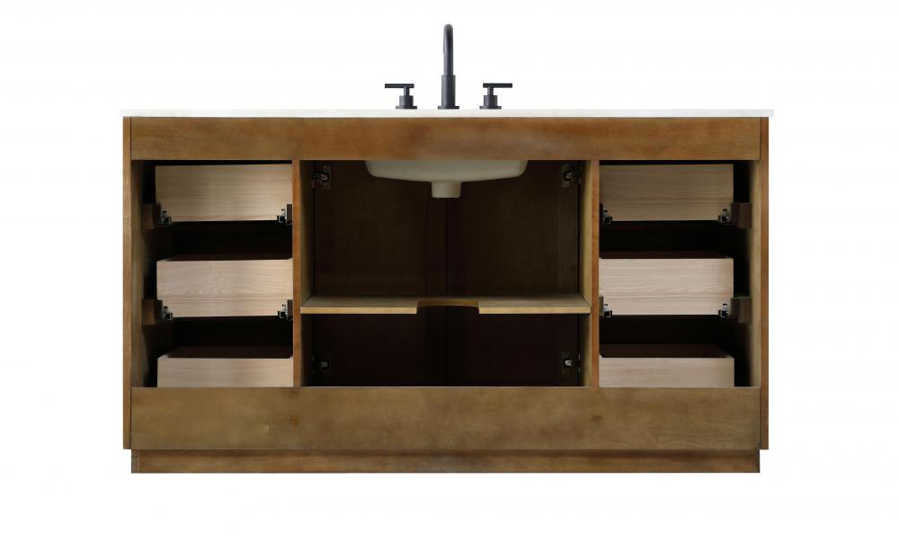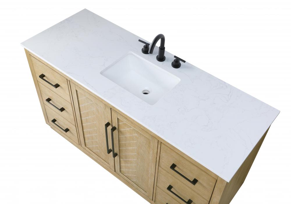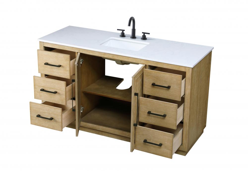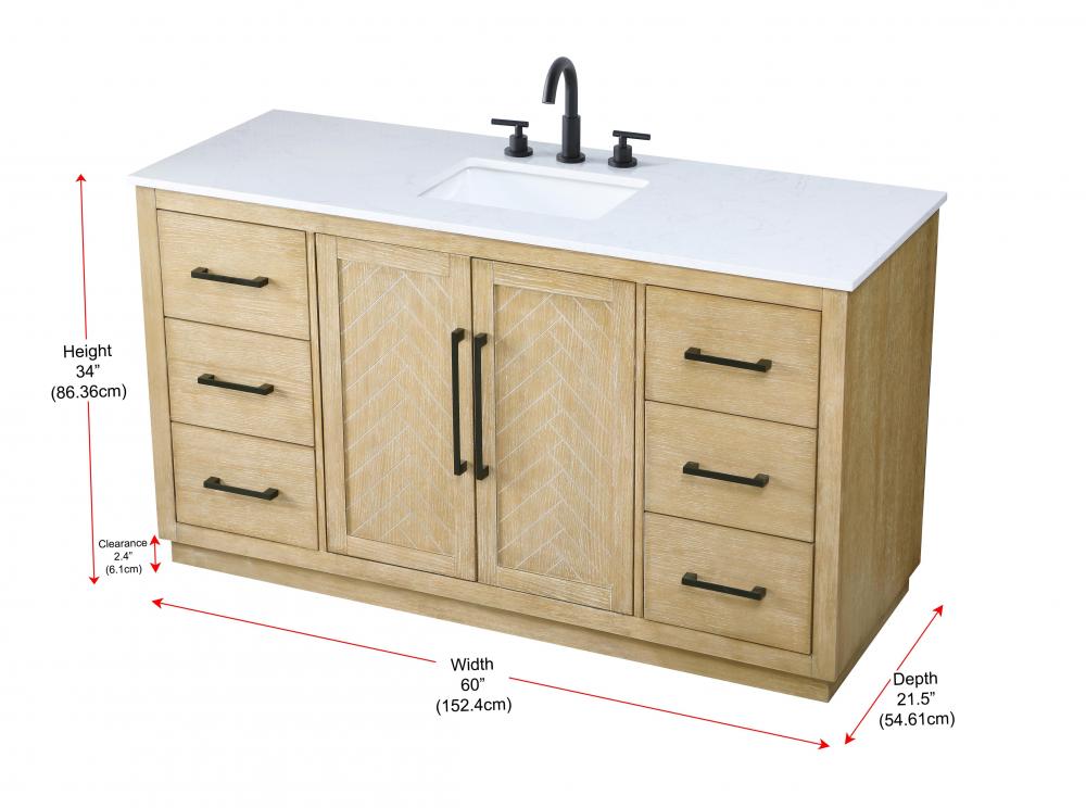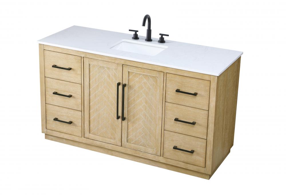 This transitional bathroom vanity offers the perfect blend of timeless style and modern functionality. Available in five refined finishes—crisp white, sleek grey, chocolate oak, honey oak, and linen oak—it complements a range of decor styles, from classic to contemporary. The stunning herringbone design on the Shaker-style door panels adds texture and craftsmanship to the piece. Topped with a white engineered marble countertop featuring subtle veining, it provides both beauty and durability. The long black metal pulls on the soft-closing doors and the thin bar pulls on the drawers add sleek, modern detailing. Practical features include a concealed overflow, a back panel cutout for easy plumbing installation, and a U-shaped cutout shelf to fit plumbing while maximizing storage space. with a toe kick all around the base, this vanity is thoughtfully designed to blend form and function in any bathroom setting.