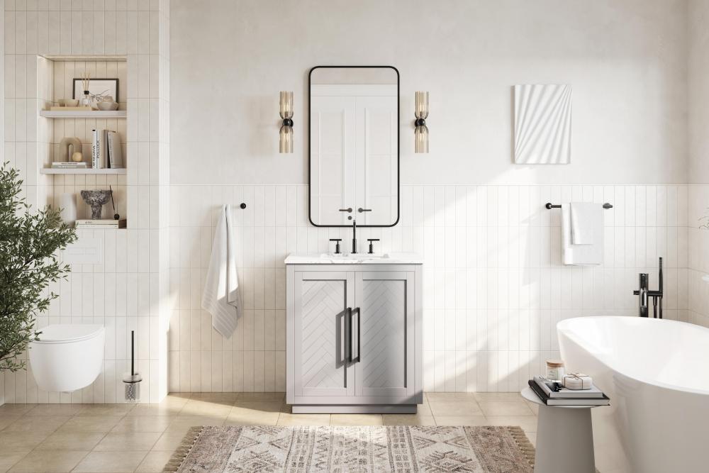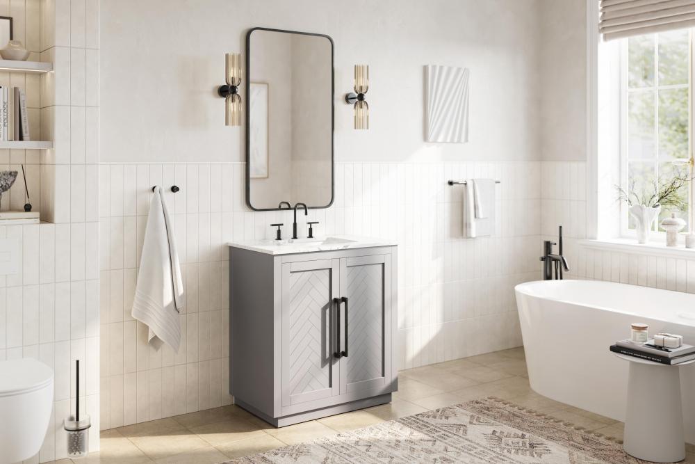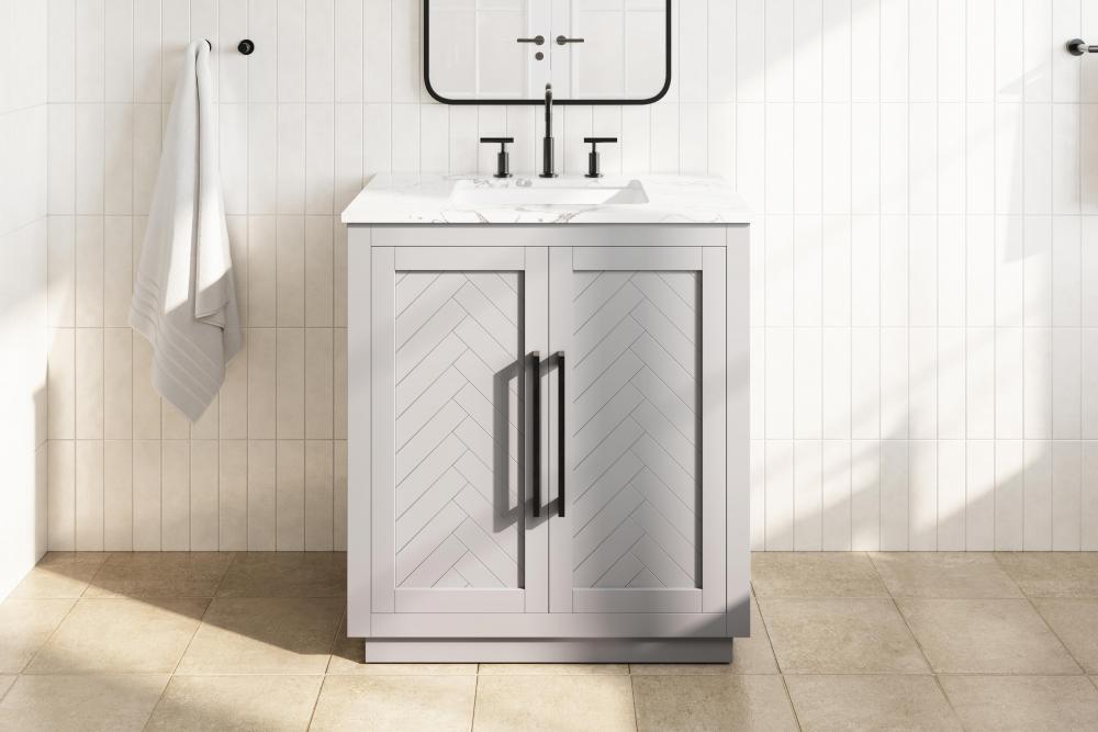 Each finish enhances the unique herringbone design on the Shaker-style door panels, adding a touch of craftsmanship and texture that elevates the overall design of the vanity.