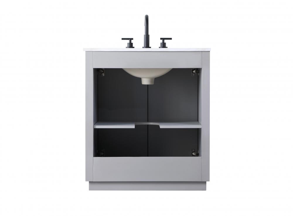 The vanity is topped with a white engineered marble countertop featuring subtle, natural-looking veining that creates a luxurious yet low-maintenance surface. This countertop adds elegance while providing durability, making it ideal for everyday use.