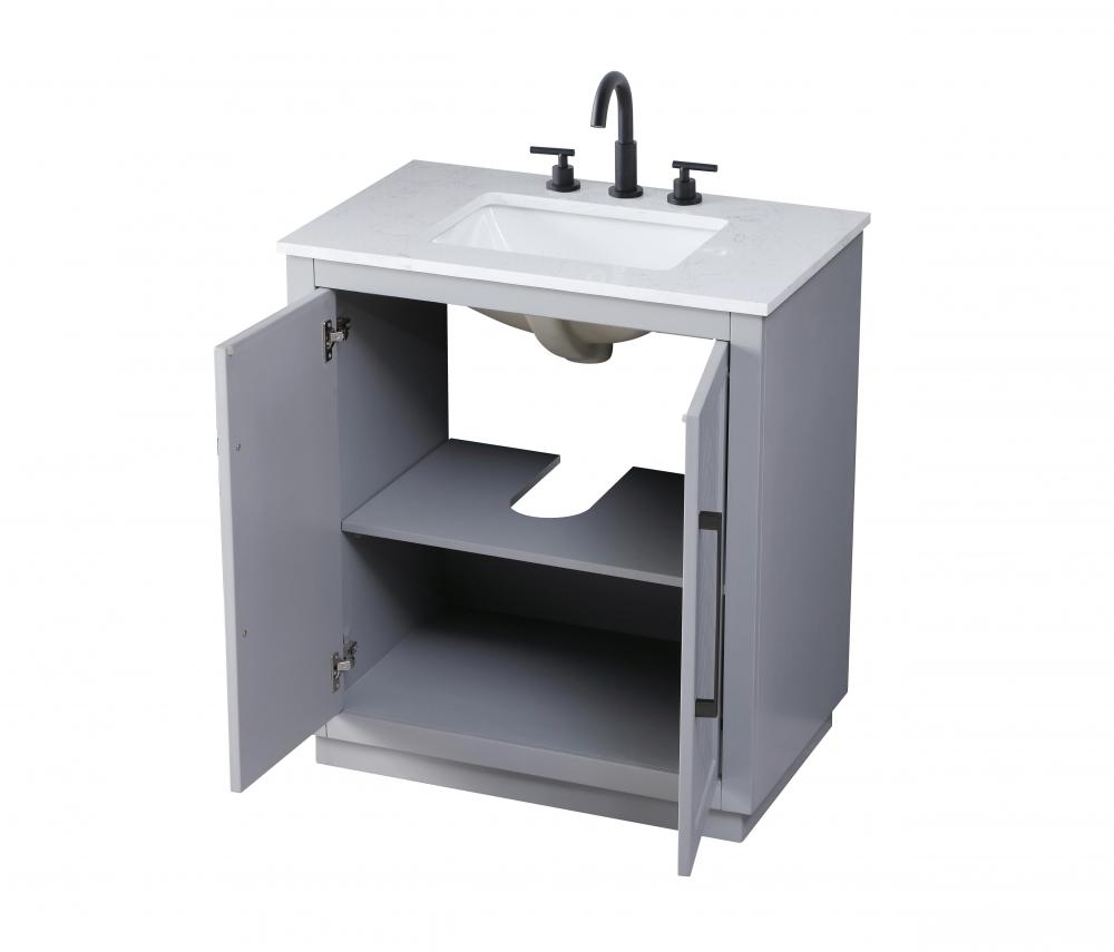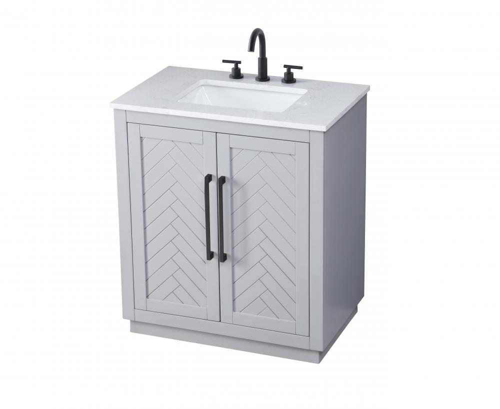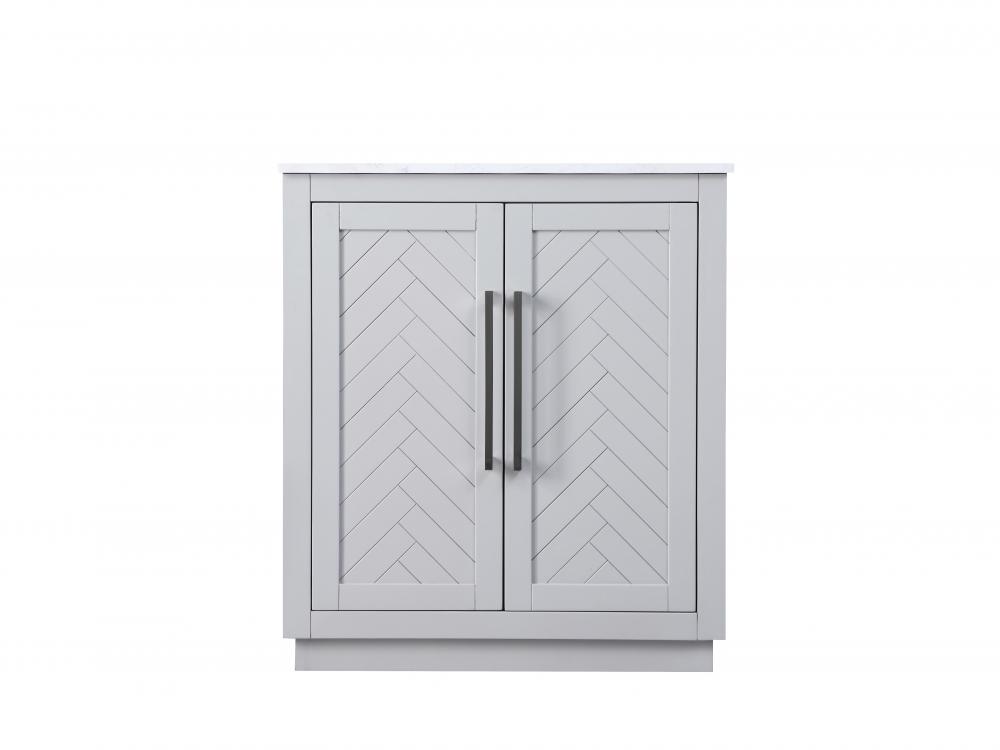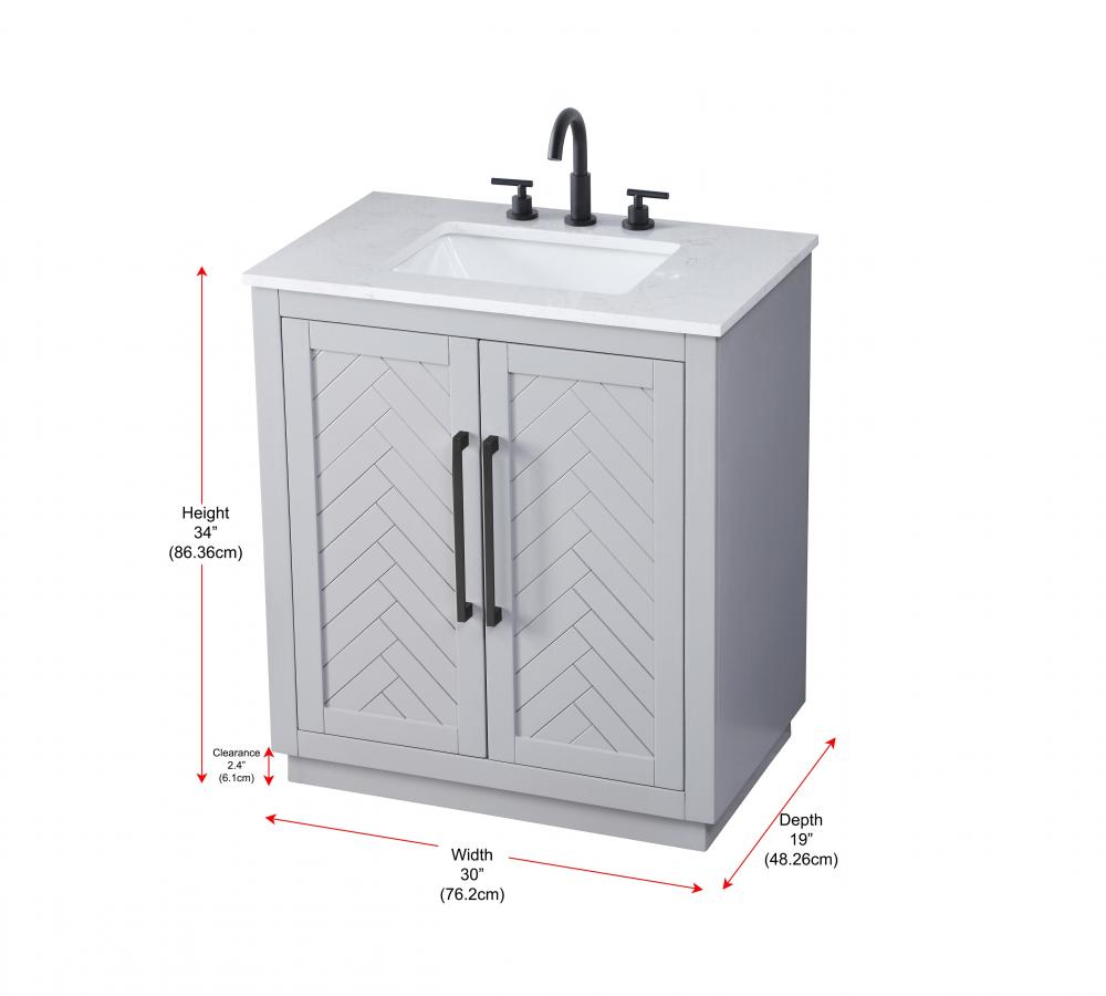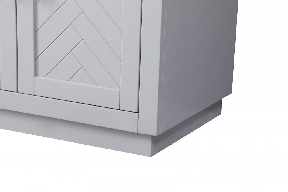 This transitional bathroom vanity offers the perfect blend of timeless style and modern functionality. Available in five refined finishes—crisp white, sleek grey, chocolate oak, honey oak, and linen oak—it complements a range of decor styles, from classic to contemporary. The stunning herringbone design on the Shaker-style door panels adds texture and craftsmanship to the piece. Topped with a white engineered marble countertop featuring subtle veining, it provides both beauty and durability. The long black metal pulls on the soft-closing doors add sleek, modern detailing. Practical features include a concealed overflow, a back panel cutout for easy plumbing installation, and a U-shaped cutout shelf to fit plumbing while maximizing storage space. with a toe kick all around the base, this vanity is thoughtfully designed to blend form and function in any bathroom setting.