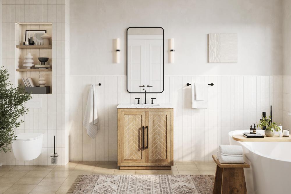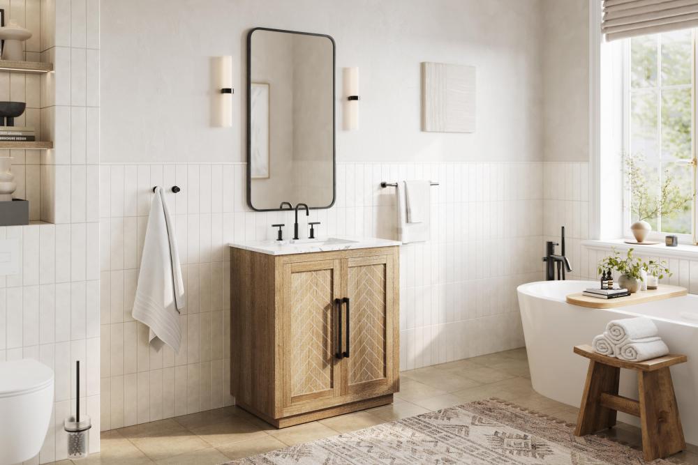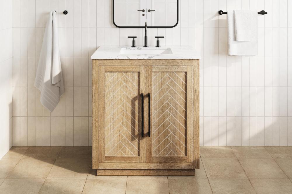 Each finish enhances the unique herringbone design on the Shaker-style door panels, adding a touch of craftsmanship and texture that elevates the overall design of the vanity.