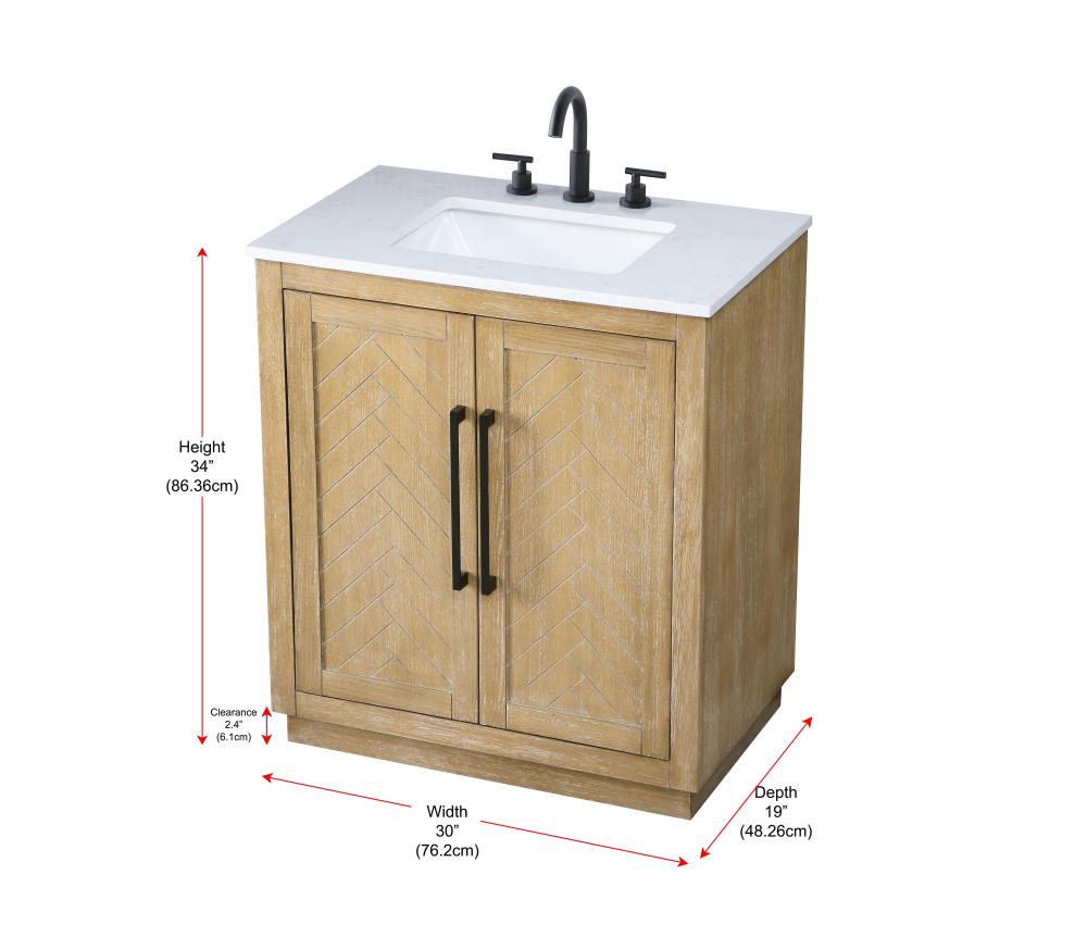 This transitional bathroom vanity offers the perfect blend of timeless style and modern functionality. Available in five refined finishes—crisp white, sleek grey, chocolate oak, honey oak, and linen oak—it complements a range of decor styles, from classic to contemporary. The stunning herringbone design on the Shaker-style door panels adds texture and craftsmanship to the piece. Topped with a white engineered marble countertop featuring subtle veining, it provides both beauty and durability. The long black metal pulls on the soft-closing doors add sleek, modern detailing. Practical features include a concealed overflow, a back panel cutout for easy plumbing installation, and a U-shaped cutout shelf to fit plumbing while maximizing storage space. with a toe kick all around the base, this vanity is thoughtfully designed to blend form and function in any bathroom setting.