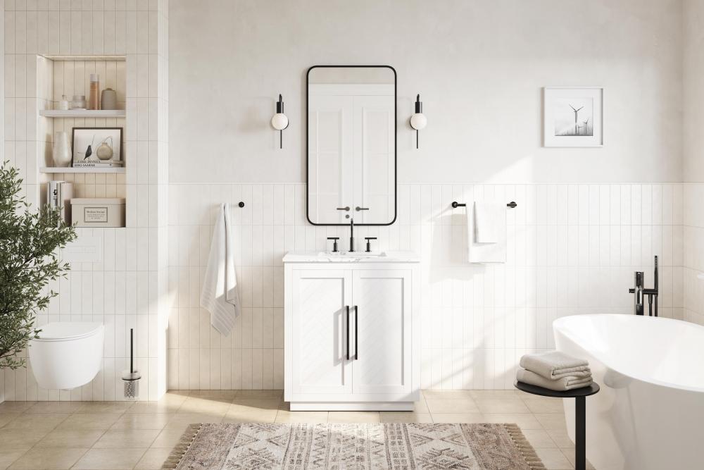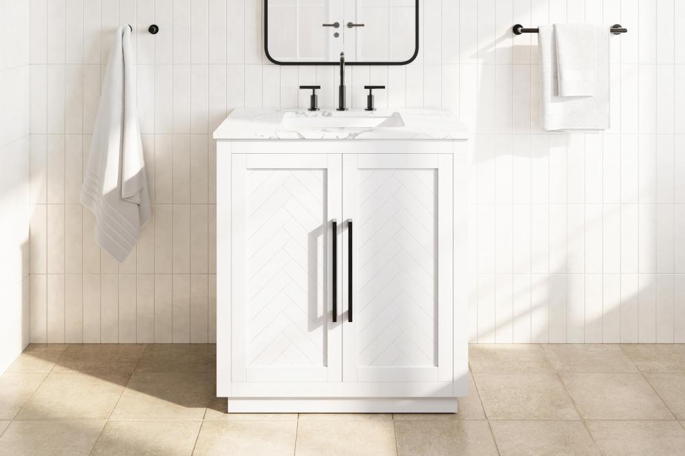 Each finish enhances the unique herringbone design on the Shaker-style door panels, adding a touch of craftsmanship and texture that elevates the overall design of the vanity.