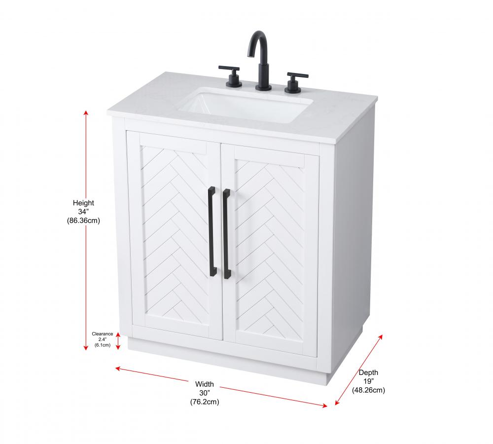 This transitional bathroom vanity offers the perfect blend of timeless style and modern functionality. Available in five refined finishes—crisp white, sleek grey, chocolate oak, honey oak, and linen oak—it complements a range of decor styles, from classic to contemporary. The stunning herringbone design on the Shaker-style door panels adds texture and craftsmanship to the piece. Topped with a white engineered marble countertop featuring subtle veining, it provides both beauty and durability. The long black metal pulls on the soft-closing doors add sleek, modern detailing. Practical features include a concealed overflow, a back panel cutout for easy plumbing installation, and a U-shaped cutout shelf to fit plumbing while maximizing storage space. with a toe kick all around the base, this vanity is thoughtfully designed to blend form and function in any bathroom setting.