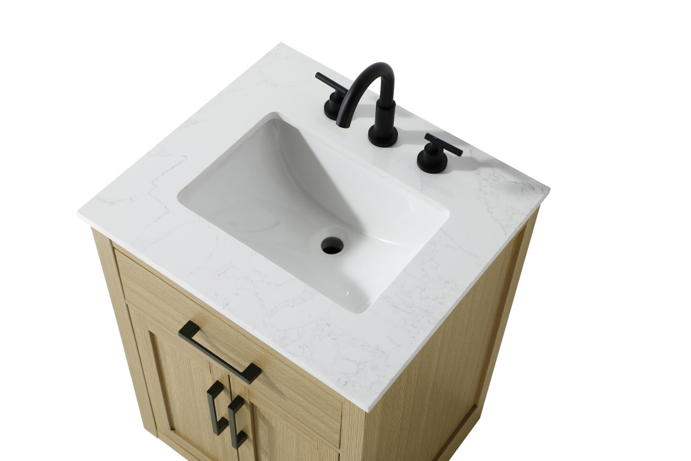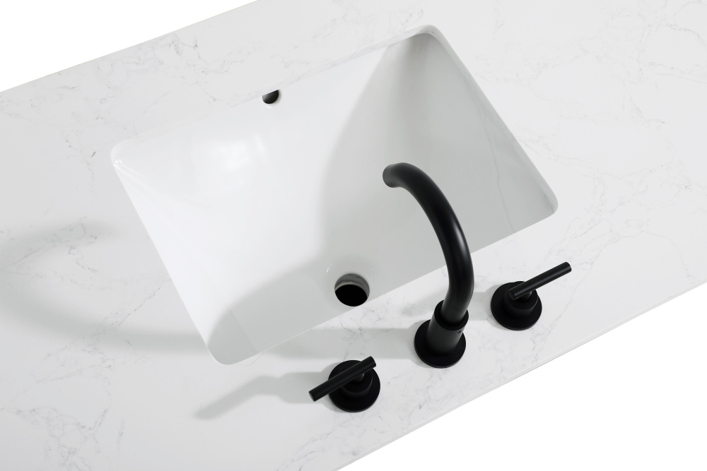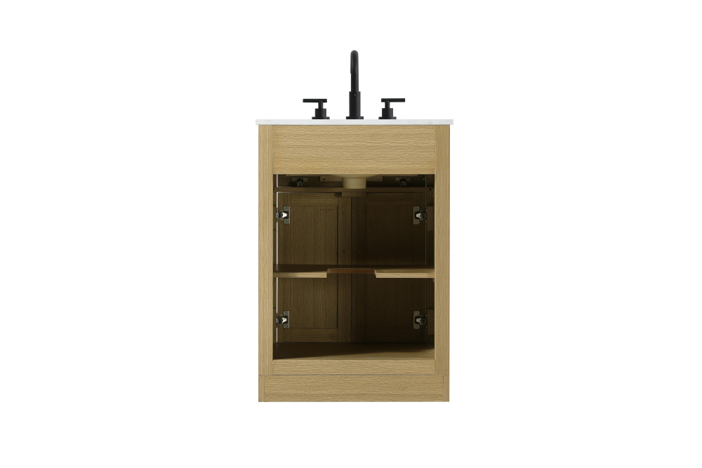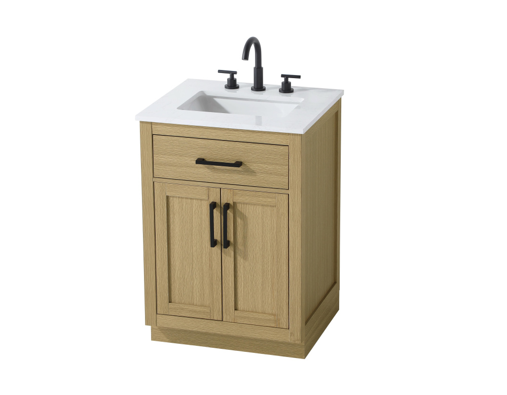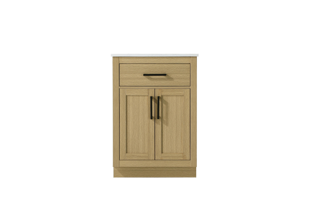 Introduce a perfect balance of functionality and style to your bathroom with this thoughtfully designed vanity. Constructed with a combination of solid wood and MDF, it offers durability and a sturdy build. The sleek engineered marble countertop with subtle grey marbling complements the rustic wood grain finish, creating a stylish and inviting centerpiece for your bathroom. Designed in a contemporary style with a transitional flair, it features a U-shaped shelf for seamless plumbing integration and multiple soft-close drawers for clutter-free organization. A pull-down drawer enhances convenience, while the toe kick adds a refined, clean-lined appearance and simplifies cleaning underneath. Matte black hardware contrasts beautifully with the cabinet finish, tying the look together. Delivered fully assembled and equipped with foot levelers, this vanity combines practicality and aesthetic appeal to suit modern and transitional bathrooms alike.