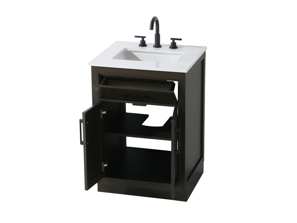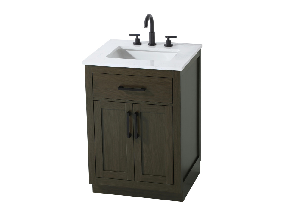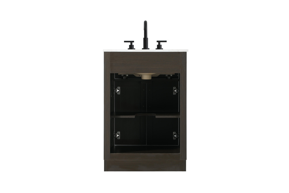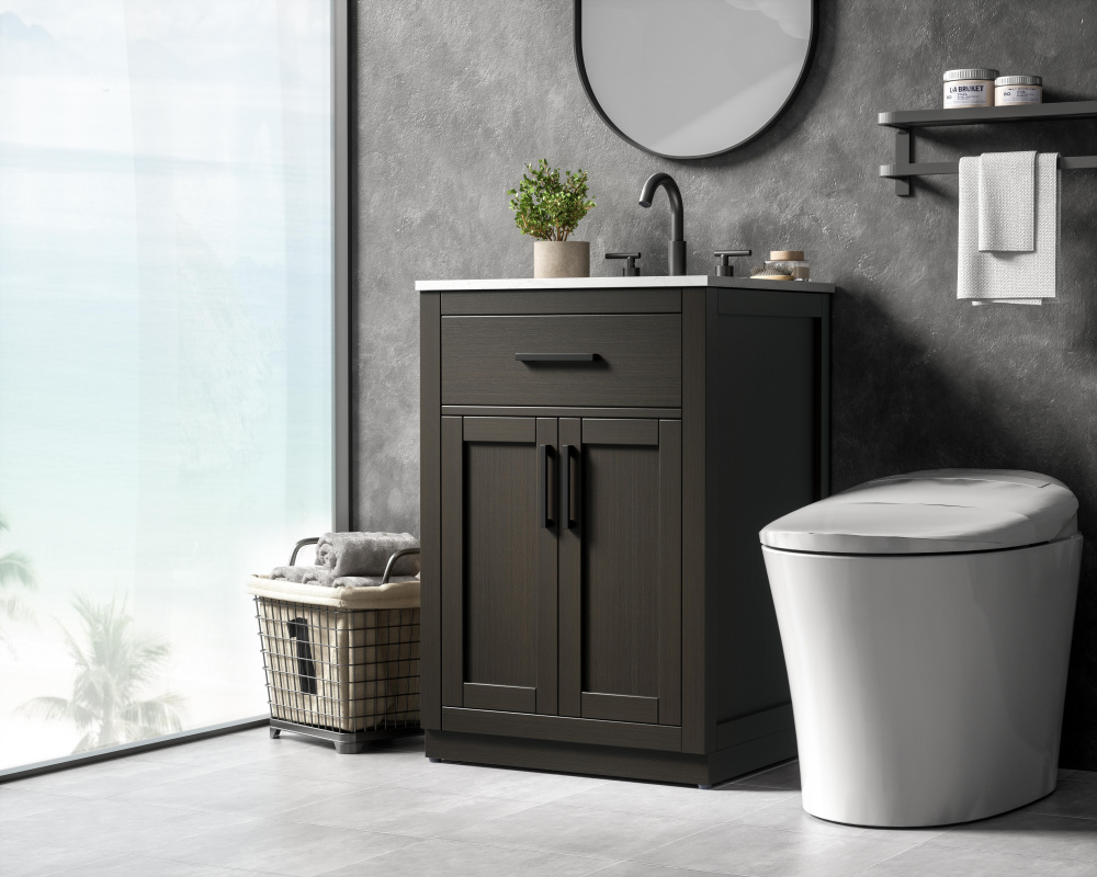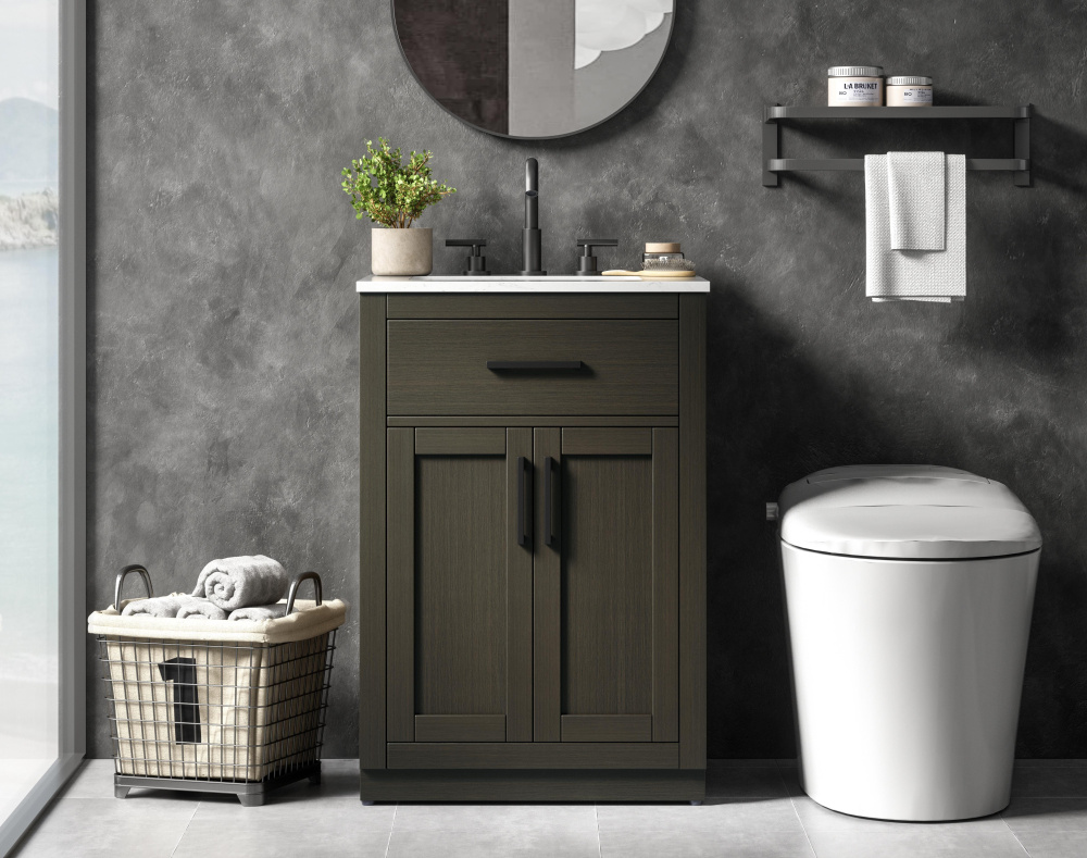 Introduce a perfect balance of functionality and style to your bathroom with this thoughtfully designed vanity. Constructed with a combination of solid wood and MDF, it offers durability and a sturdy build. The sleek engineered marble countertop with subtle grey marbling complements the rustic wood grain finish, creating a stylish and inviting centerpiece for your bathroom. Designed in a contemporary style with a transitional flair, it features a U-shaped shelf for seamless plumbing integration and multiple soft-close drawers for clutter-free organization. A pull-down drawer enhances convenience, while the toe kick adds a refined, clean-lined appearance and simplifies cleaning underneath. Matte black hardware contrasts beautifully with the cabinet finish, tying the look together. Delivered fully assembled and equipped with foot levelers, this vanity combines practicality and aesthetic appeal to suit modern and transitional bathrooms alike.