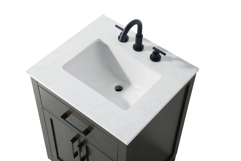 Engineered marble countertop with subtle grey marbling adds sophistication.
