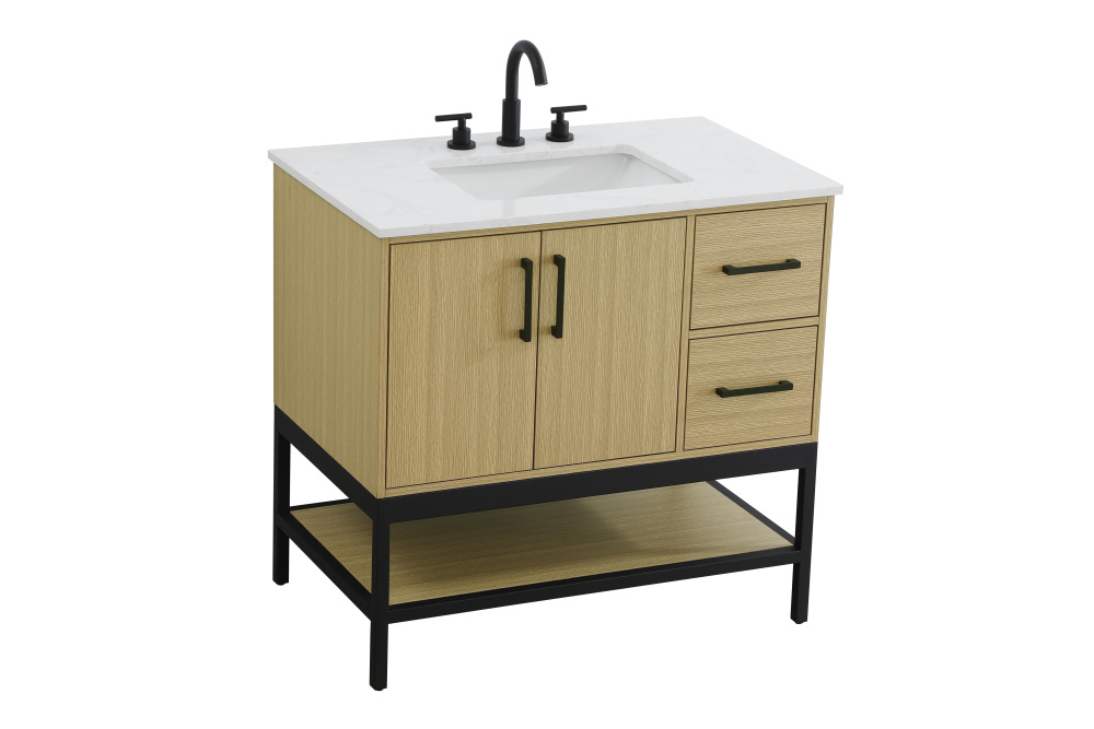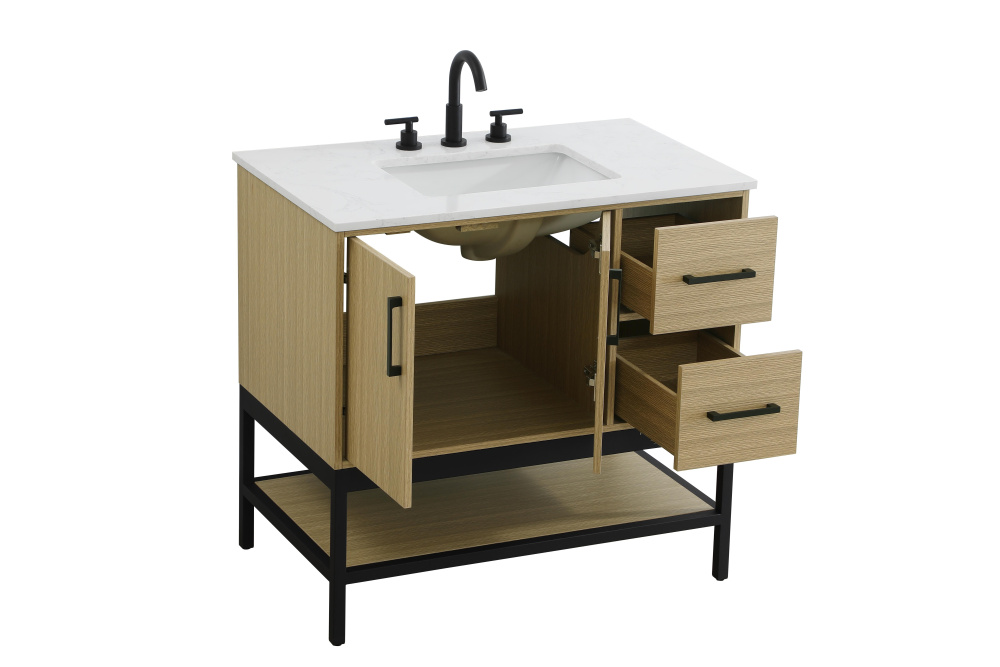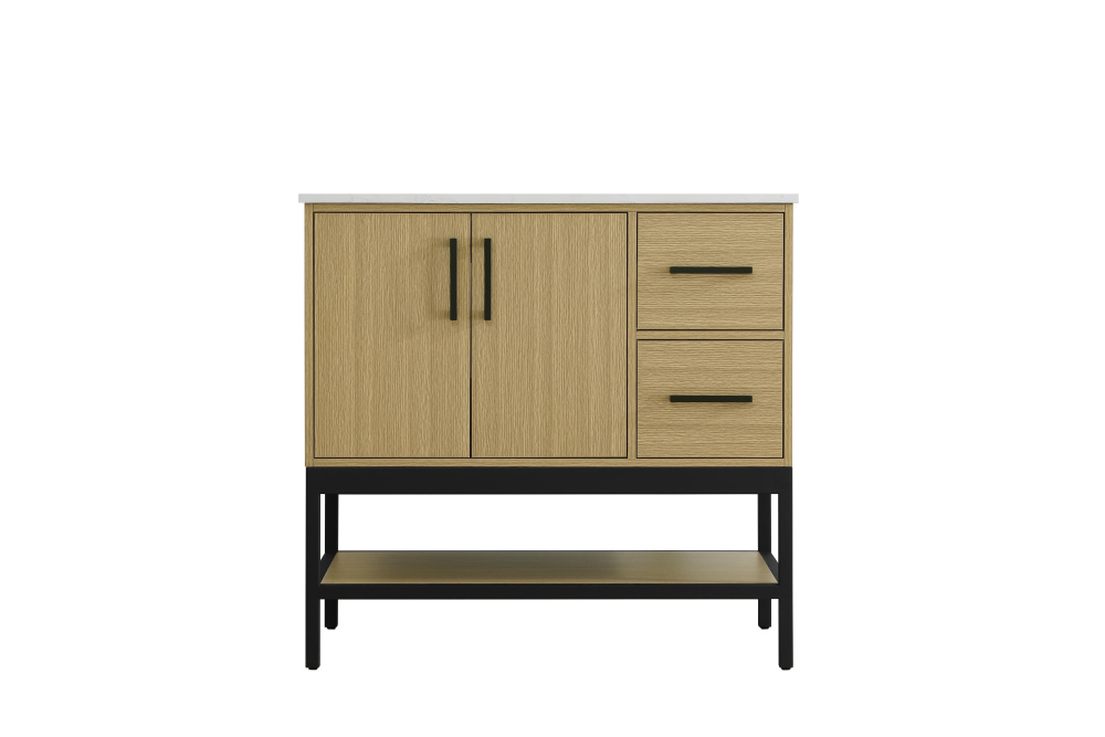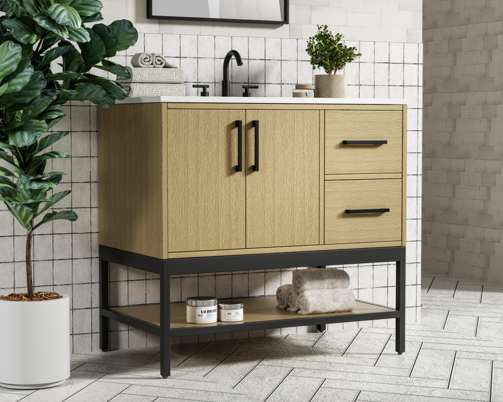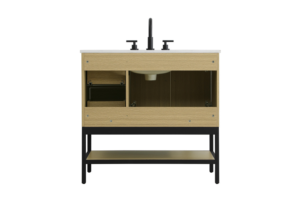 Upgrade your bathroom with this modern bathroom vanity that combines form and function effortlessly. Its sleek wood veneer cabinetry, paired with a bold black metal frame, brings a clean, contemporary vibe to any space. Designed with practicality in mind, this vanity offers soft-close drawers and cabinets to organize your essentials, as well as an open lower shelf for added storage or display. The durable white quartz countertop is built to withstand daily use, while the undermount ceramic sink ensures easy maintenance. Complete with matte black hardware and pre-drilled features for effortless installation, this vanity is the perfect centerpiece to refresh your bathroom with style and efficiency.