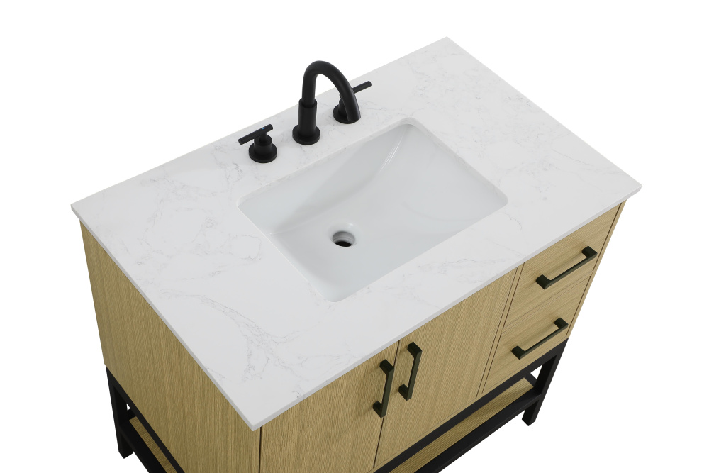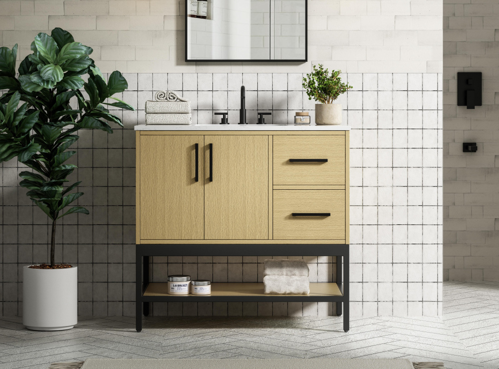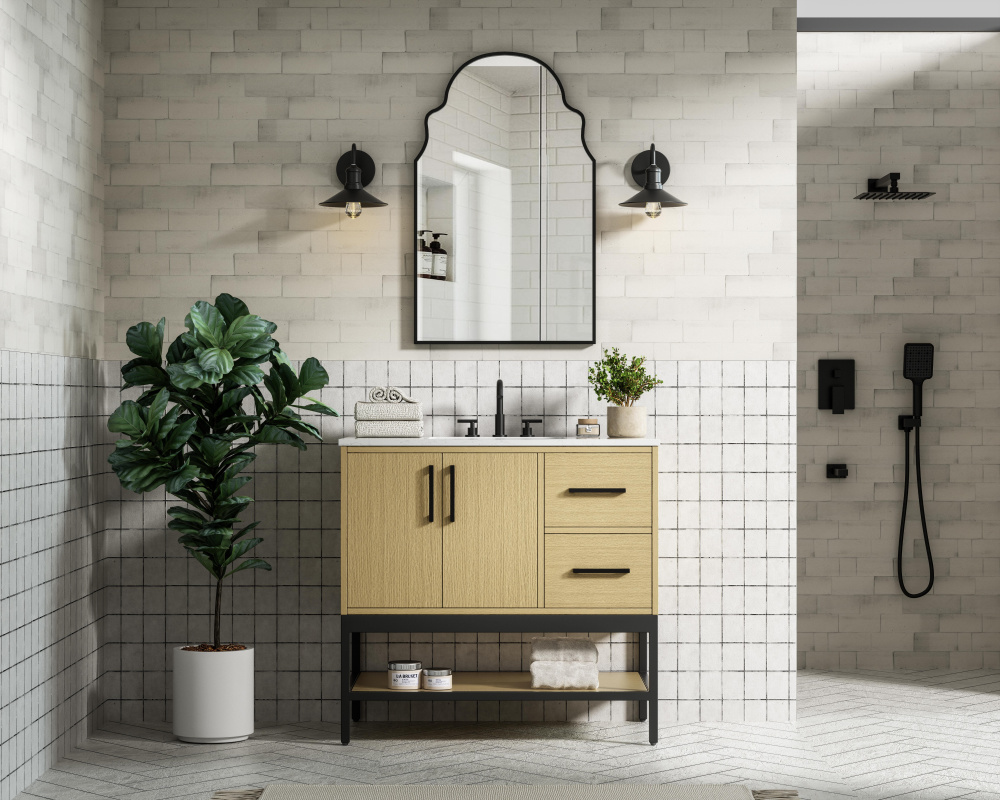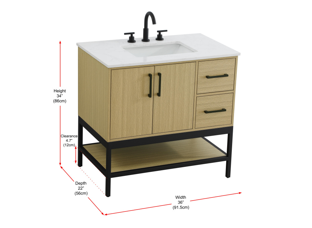 Upgrade your bathroom with this modern bathroom vanity that combines form and function effortlessly. Its sleek wood veneer cabinetry, paired with a bold black metal frame, brings a clean, contemporary vibe to any space. Designed with practicality in mind, this vanity offers soft-close drawers and cabinets to organize your essentials, as well as an open lower shelf for added storage or display. The durable white quartz countertop is built to withstand daily use, while the undermount ceramic sink ensures easy maintenance. Complete with matte black hardware and pre-drilled features for effortless installation, this vanity is the perfect centerpiece to refresh your bathroom with style and efficiency.