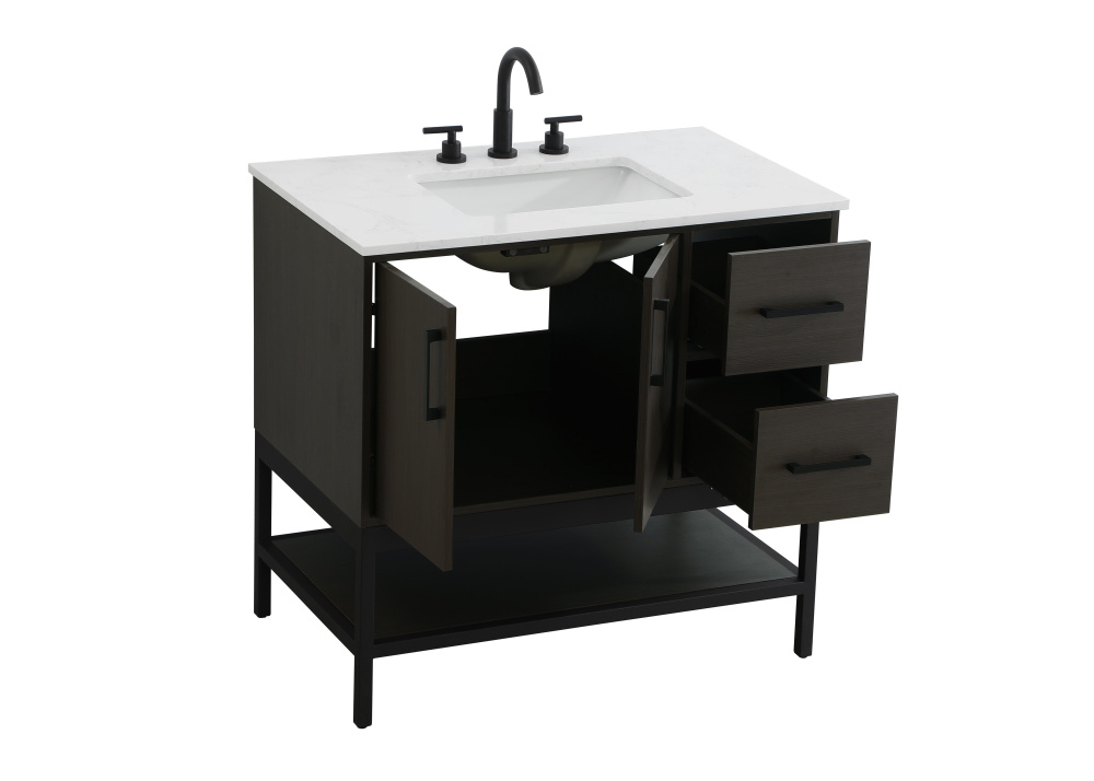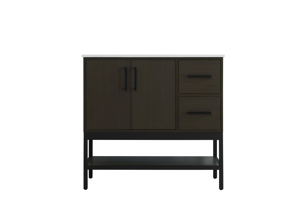 Upgrade your bathroom with this modern bathroom vanity that combines form and function effortlessly. Its sleek wood veneer cabinetry, paired with a bold black metal frame, brings a clean, contemporary vibe to any space. Designed with practicality in mind, this vanity offers soft-close drawers and cabinets to organize your essentials, as well as an open lower shelf for added storage or display. The durable white quartz countertop is built to withstand daily use, while the undermount ceramic sink ensures easy maintenance. Complete with matte black hardware and pre-drilled features for effortless installation, this vanity is the perfect centerpiece to refresh your bathroom with style and efficiency.