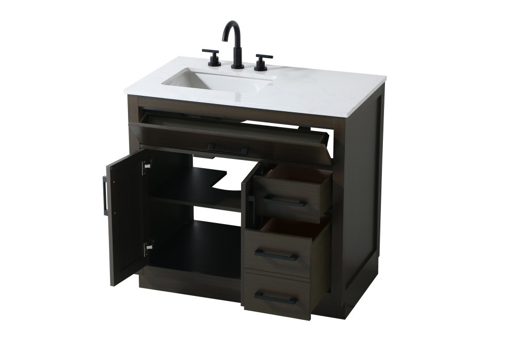 Introduce a perfect balance of functionality and style to your bathroom with this thoughtfully designed vanity. Constructed with a combination of solid wood and MDF, it offers durability and a sturdy build. The sleek engineered marble countertop with subtle grey marbling complements the rustic wood grain finish, creating a stylish and inviting centerpiece for your bathroom. Designed in a contemporary style with a transitional flair, it features a U-shaped shelf for seamless plumbing integration and multiple soft-close drawers for clutter-free organization. A pull-down drawer enhances convenience, while the toe kick adds a refined, clean-lined appearance and simplifies cleaning underneath. Matte black hardware contrasts beautifully with the cabinet finish, tying the look together. Delivered fully assembled and equipped with foot levelers, this vanity combines practicality and aesthetic appeal to suit modern and transitional bathrooms alike.