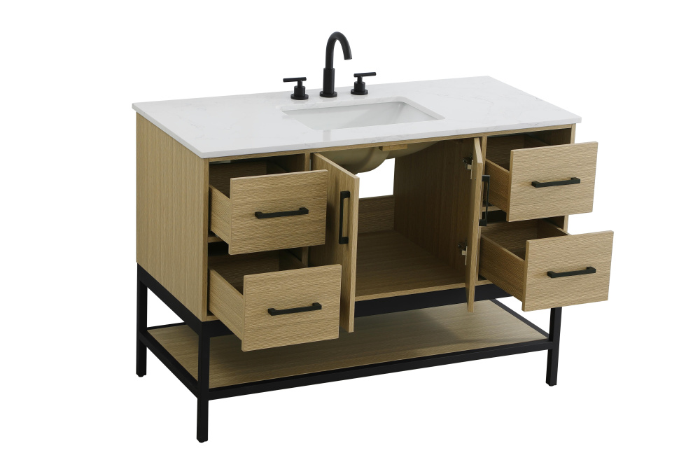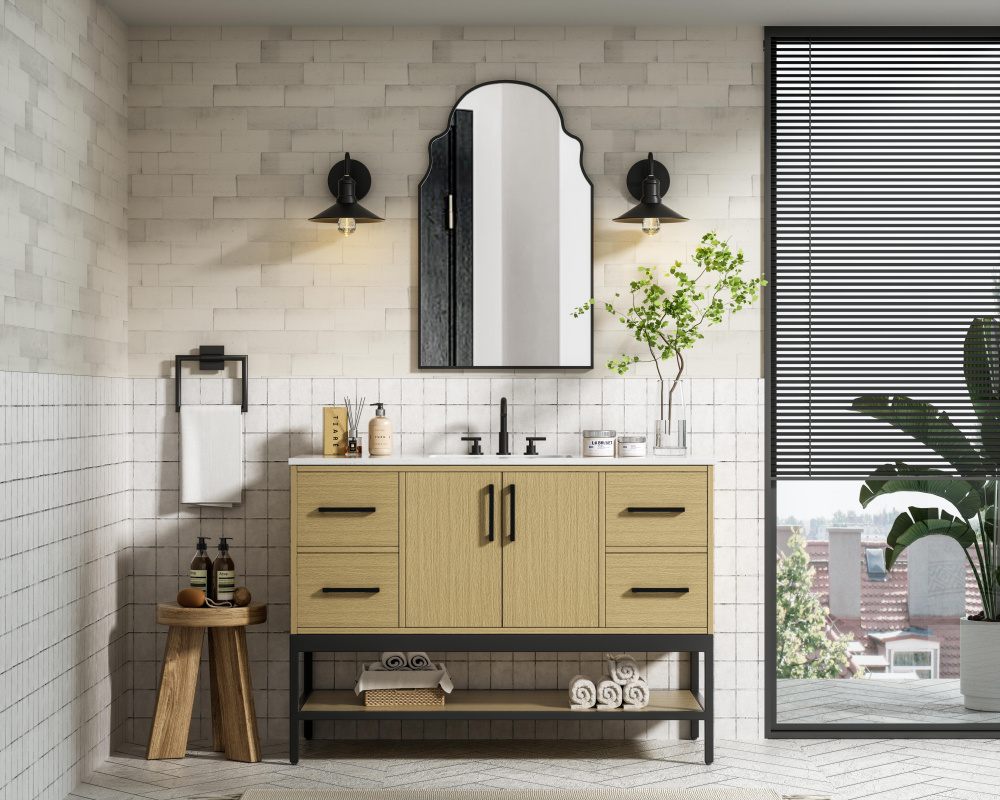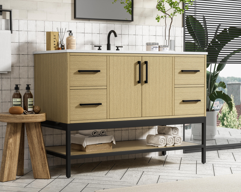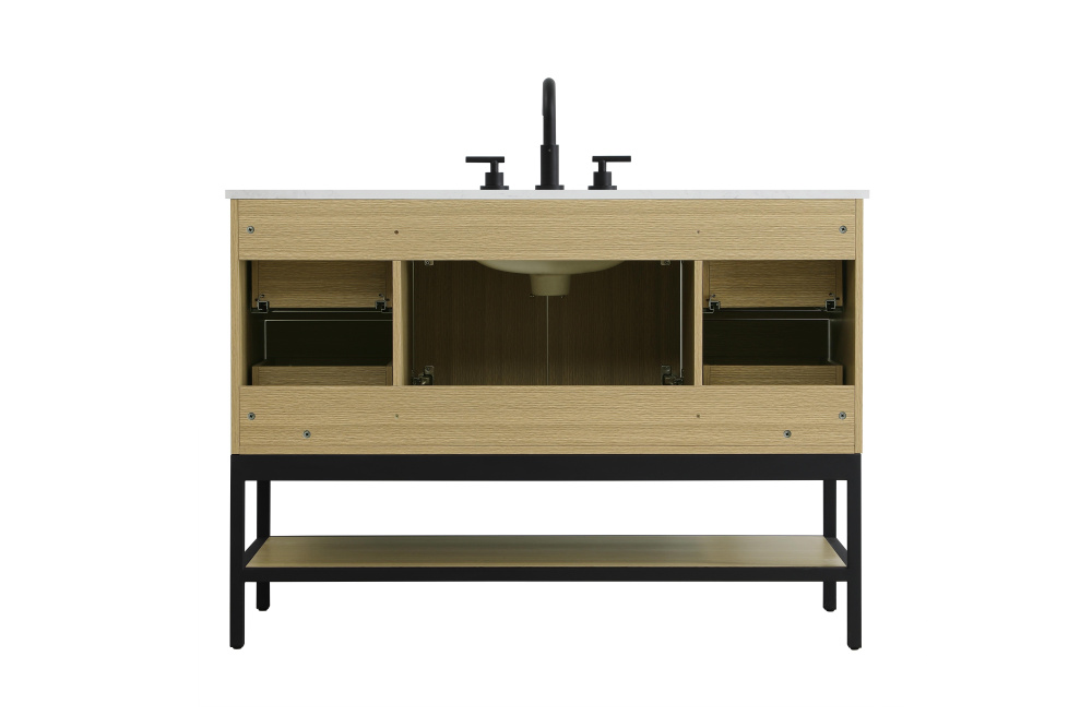 Upgrade your bathroom with this modern bathroom vanity that combines form and function effortlessly. Its sleek wood veneer cabinetry, paired with a bold black metal frame, brings a clean, contemporary vibe to any space. Designed with practicality in mind, this vanity offers soft-close drawers and cabinets to organize your essentials, as well as an open lower shelf for added storage or display. The durable white quartz countertop is built to withstand daily use, while the undermount ceramic sink ensures easy maintenance. Complete with matte black hardware and pre-drilled features for effortless installation, this vanity is the perfect centerpiece to refresh your bathroom with style and efficiency.