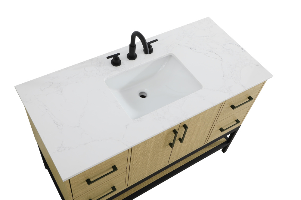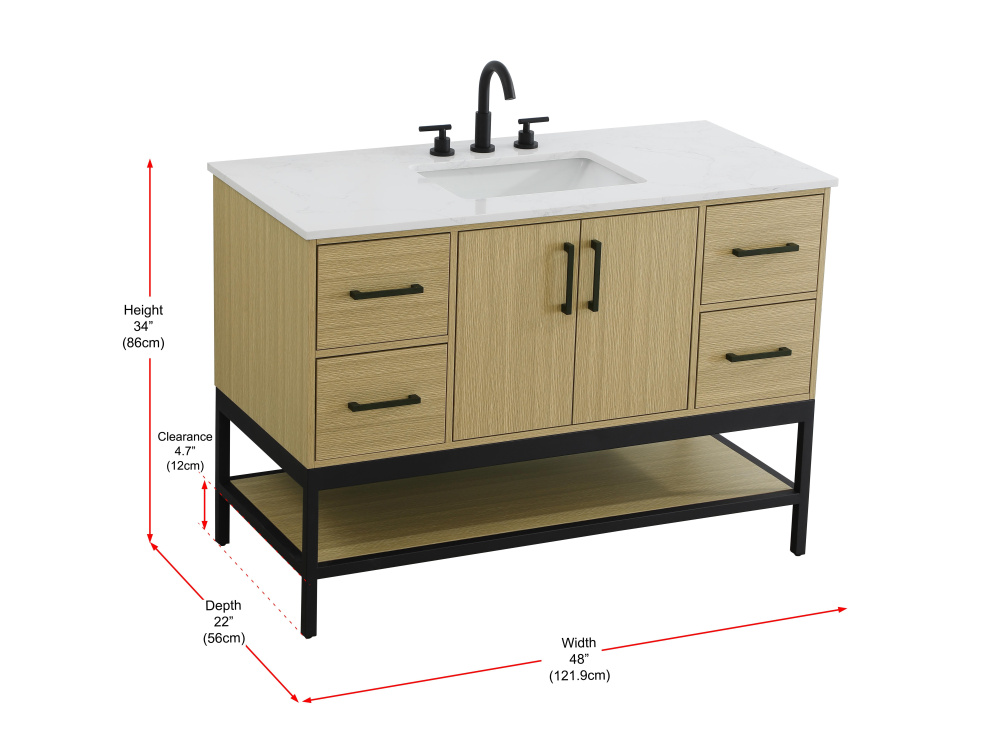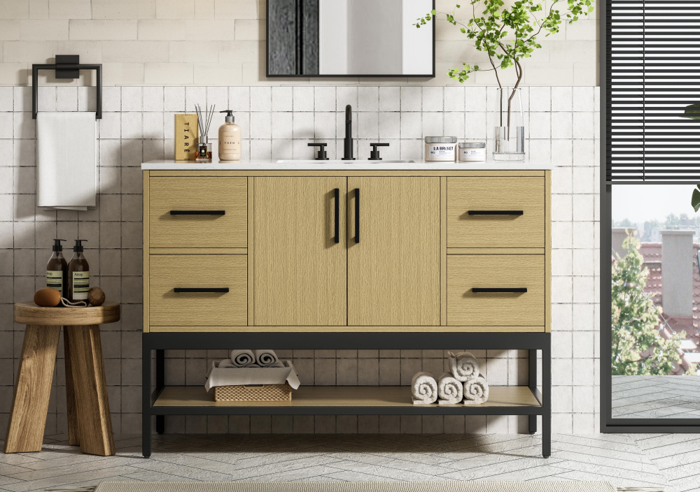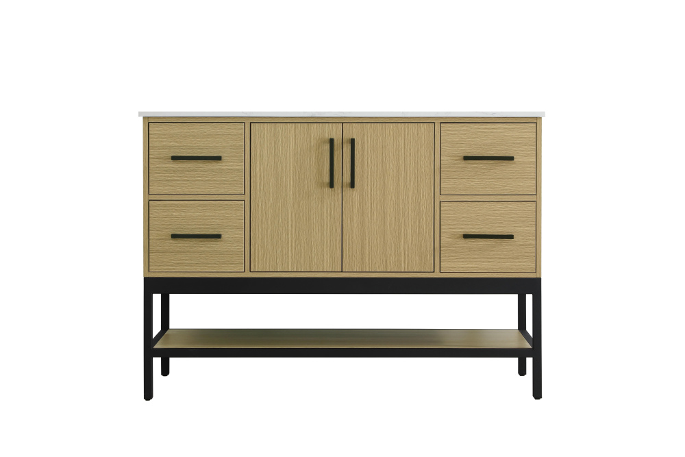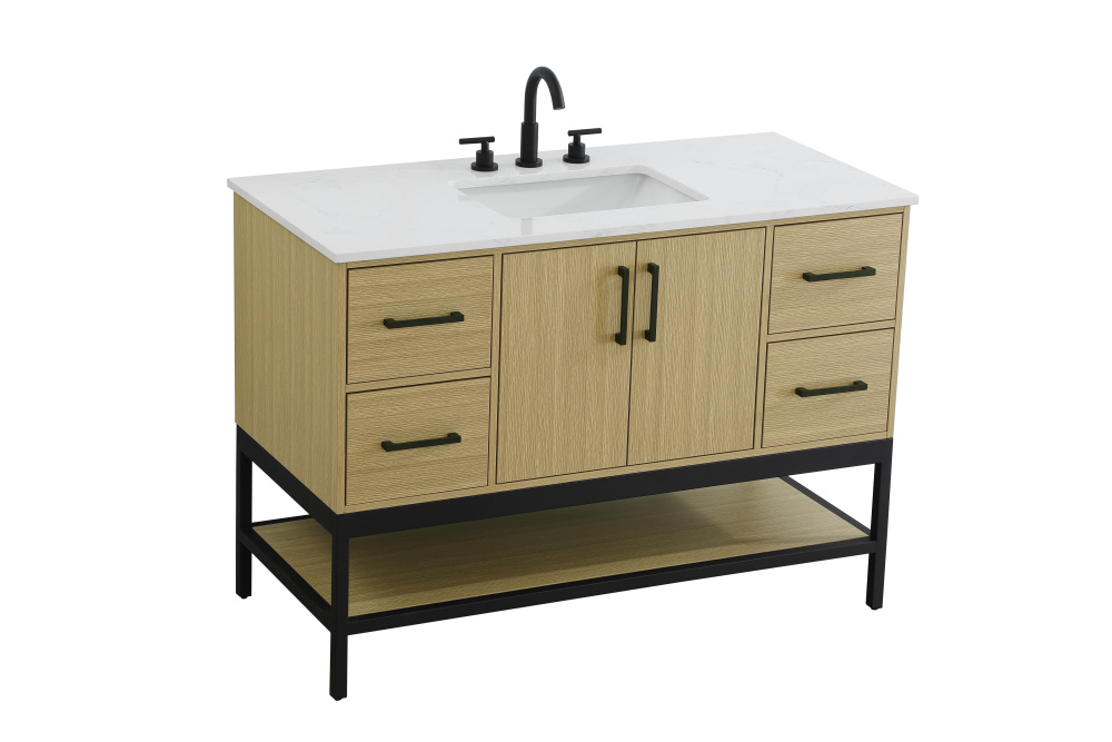 Upgrade your bathroom with this modern bathroom vanity that combines form and function effortlessly. Its sleek wood veneer cabinetry, paired with a bold black metal frame, brings a clean, contemporary vibe to any space. Designed with practicality in mind, this vanity offers soft-close drawers and cabinets to organize your essentials, as well as an open lower shelf for added storage or display. The durable white quartz countertop is built to withstand daily use, while the undermount ceramic sink ensures easy maintenance. Complete with matte black hardware and pre-drilled features for effortless installation, this vanity is the perfect centerpiece to refresh your bathroom with style and efficiency.