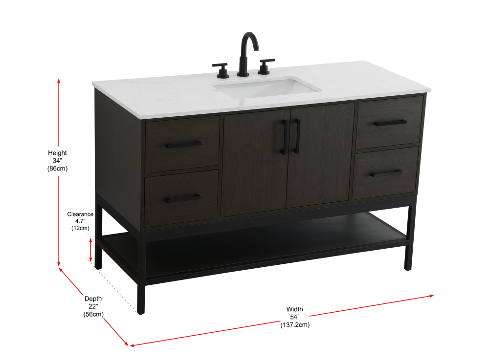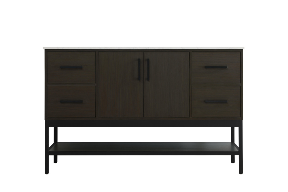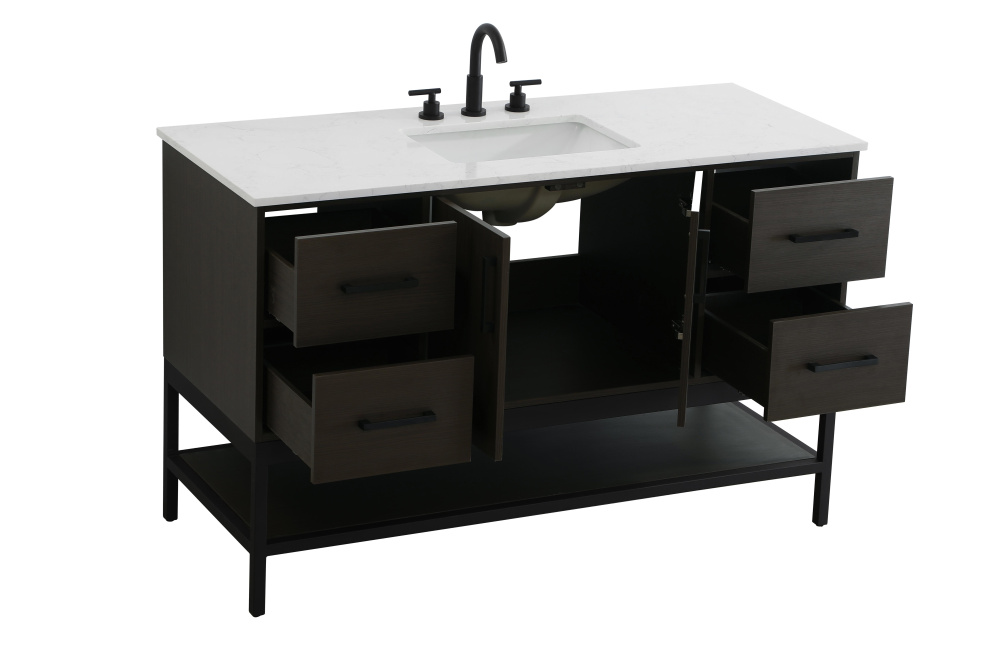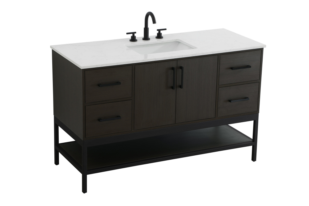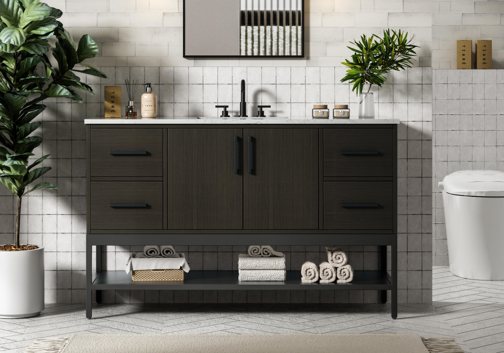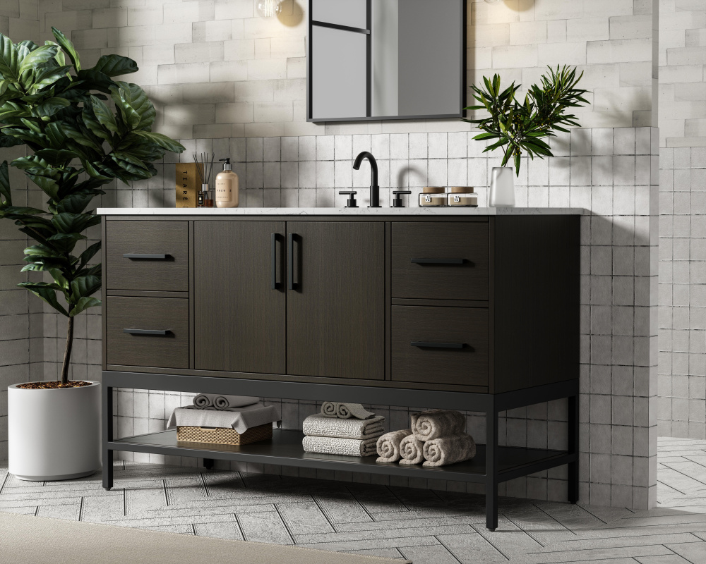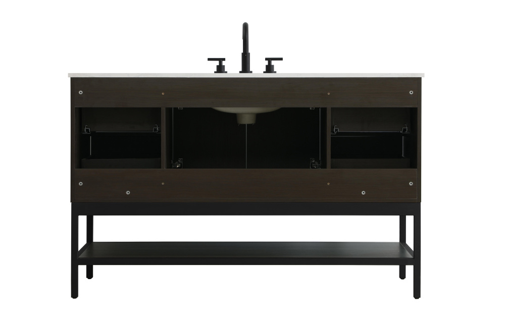 Upgrade your bathroom with this modern bathroom vanity that combines form and function effortlessly. Its sleek wood veneer cabinetry, paired with a bold black metal frame, brings a clean, contemporary vibe to any space. Designed with practicality in mind, this vanity offers soft-close drawers and cabinets to organize your essentials, as well as an open lower shelf for added storage or display. The durable white quartz countertop is built to withstand daily use, while the undermount ceramic sink ensures easy maintenance. Complete with matte black hardware and pre-drilled features for effortless installation, this vanity is the perfect centerpiece to refresh your bathroom with style and efficiency.