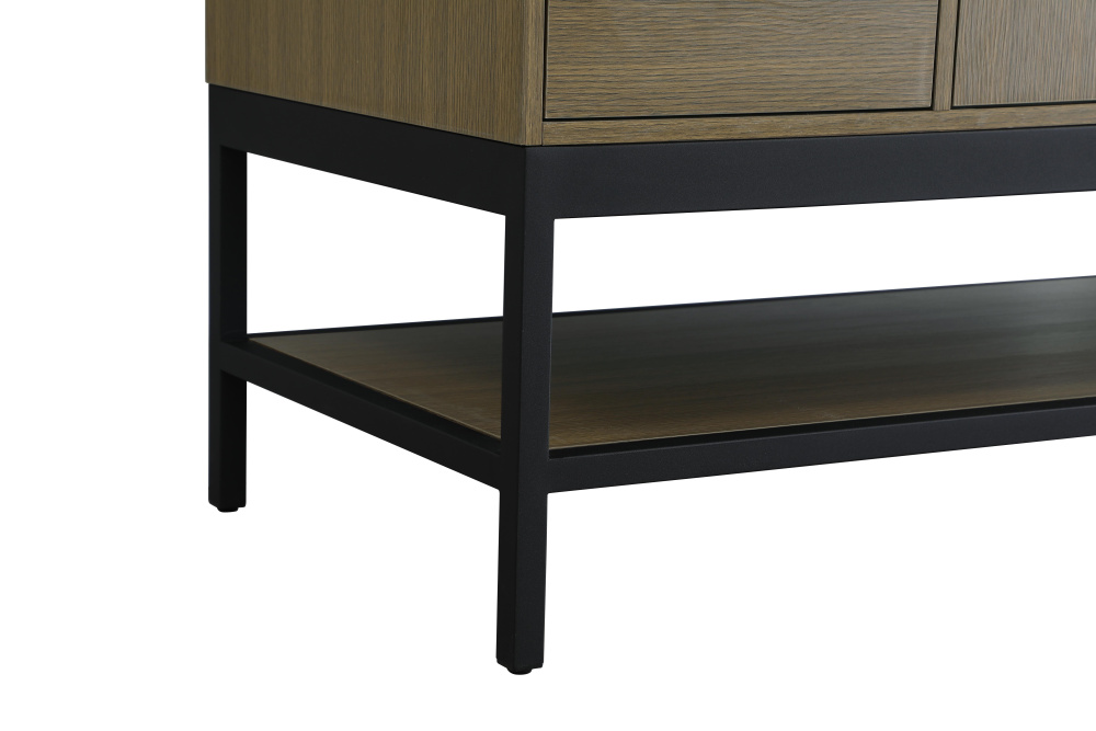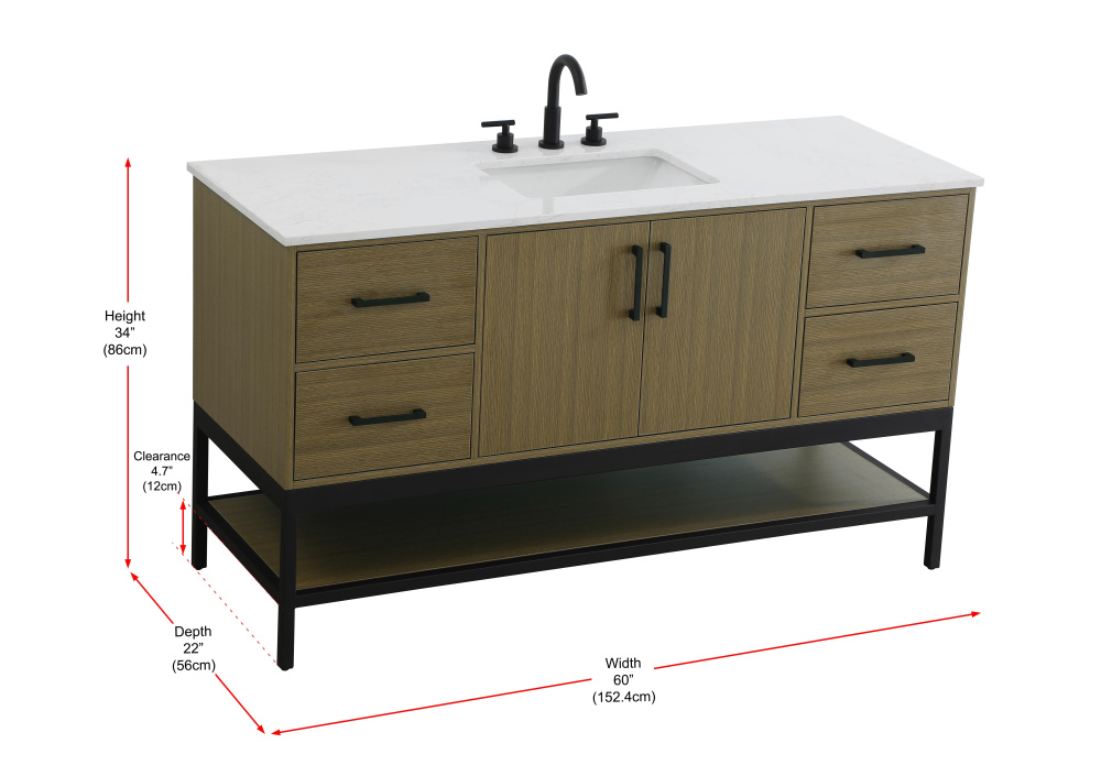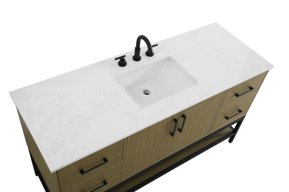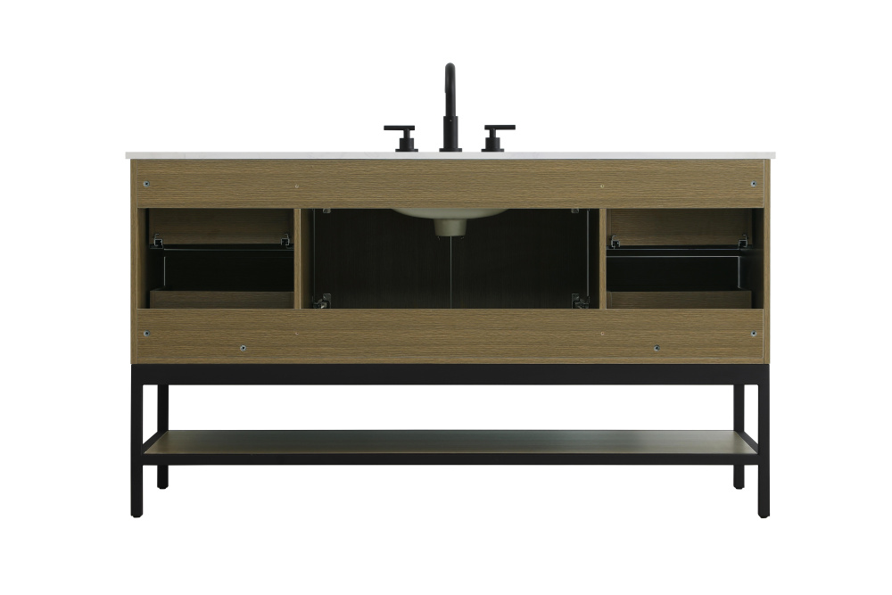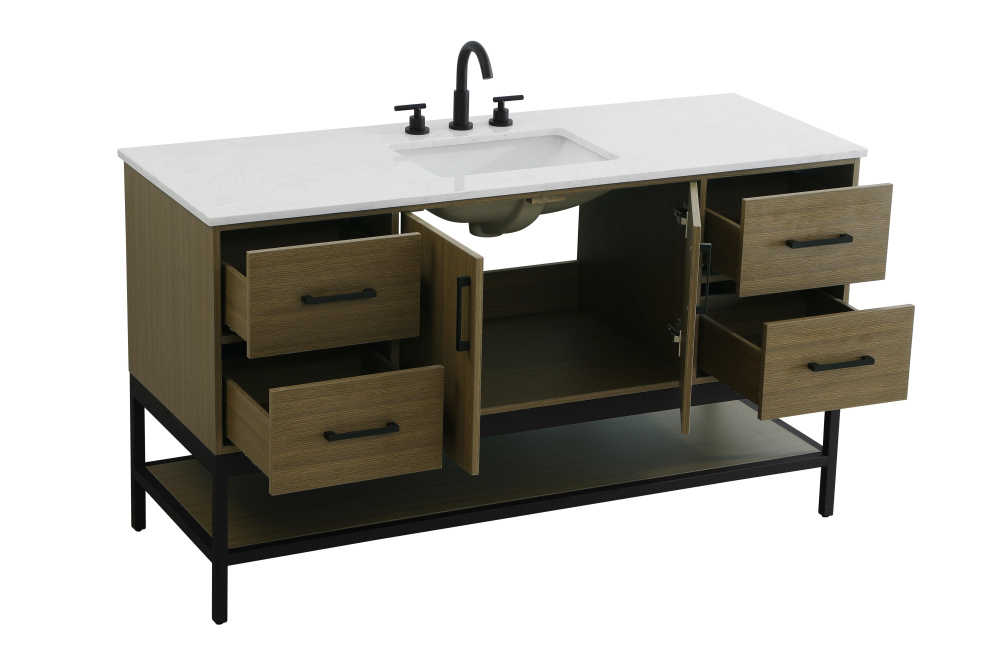Upgrade your bathroom with this modern bathroom vanity that combines form and function effortlessly. Its sleek wood veneer cabinetry, paired with a bold black metal frame, brings a clean, contemporary vibe to any space. Designed with practicality in mind, this vanity offers soft-close drawers and cabinets to organize your essentials, as well as an open lower shelf for added storage or display. The durable white quartz countertop is built to withstand daily use, while the undermount ceramic sink ensures easy maintenance. Complete with matte black hardware and pre-drilled features for effortless installation, this vanity is the perfect centerpiece to refresh your bathroom with style and efficiency.