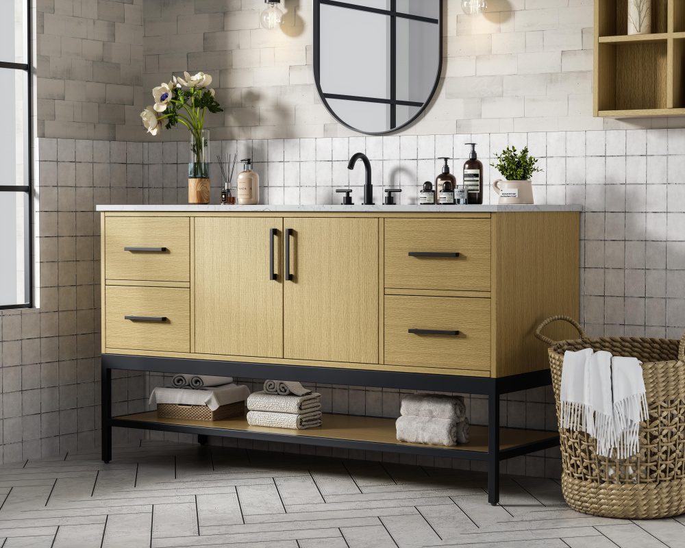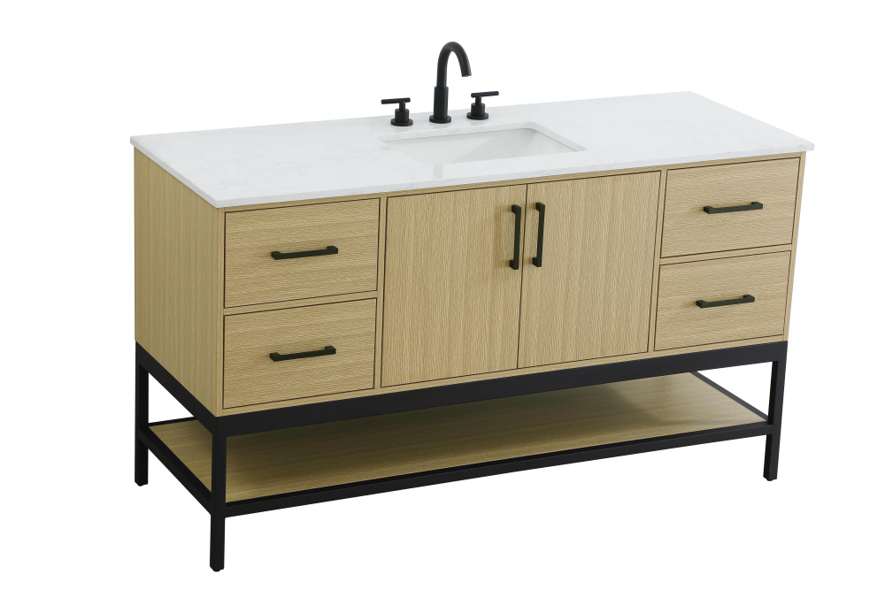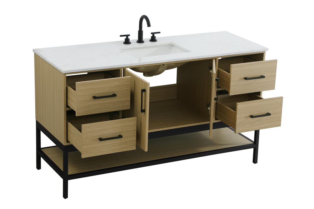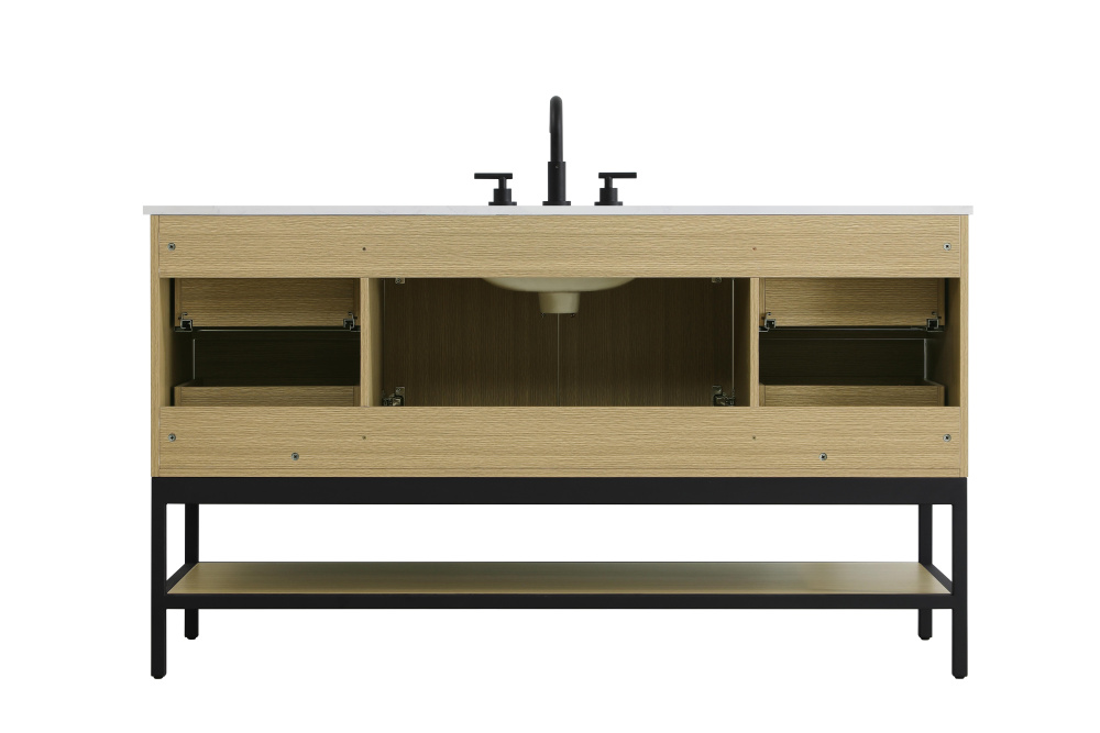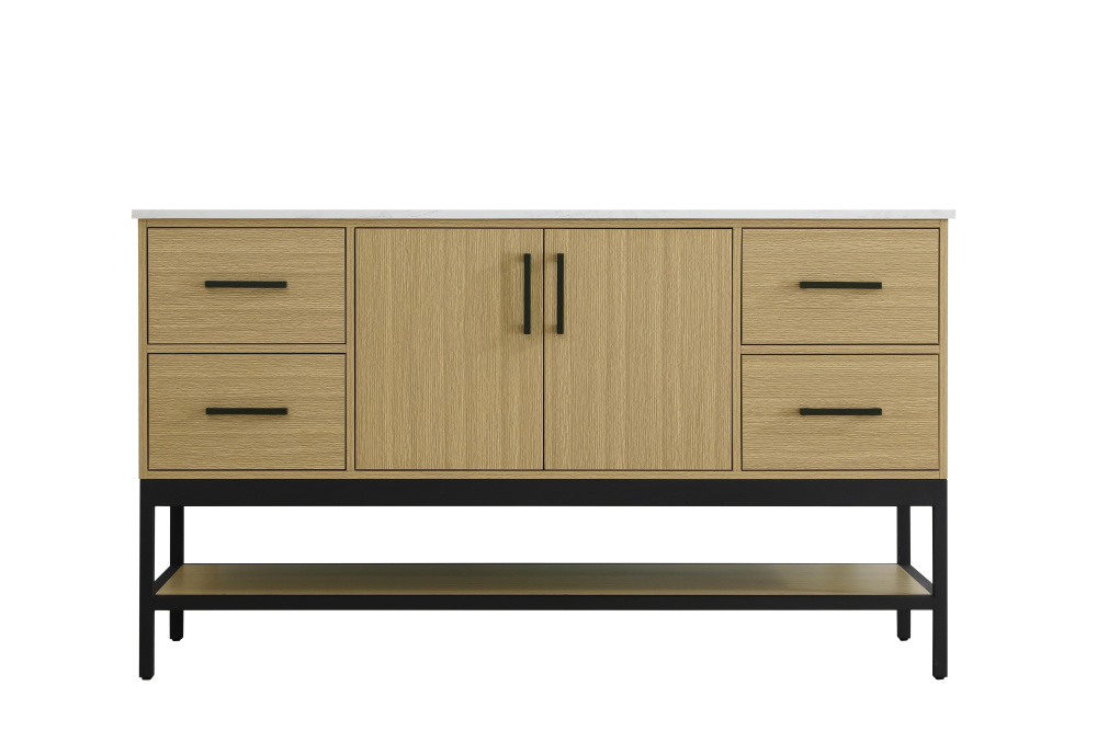 Upgrade your bathroom with this modern bathroom vanity that combines form and function effortlessly. Its sleek wood veneer cabinetry, paired with a bold black metal frame, brings a clean, contemporary vibe to any space. Designed with practicality in mind, this vanity offers soft-close drawers and cabinets to organize your essentials, as well as an open lower shelf for added storage or display. The durable white quartz countertop is built to withstand daily use, while the undermount ceramic sink ensures easy maintenance. Complete with matte black hardware and pre-drilled features for effortless installation, this vanity is the perfect centerpiece to refresh your bathroom with style and efficiency.