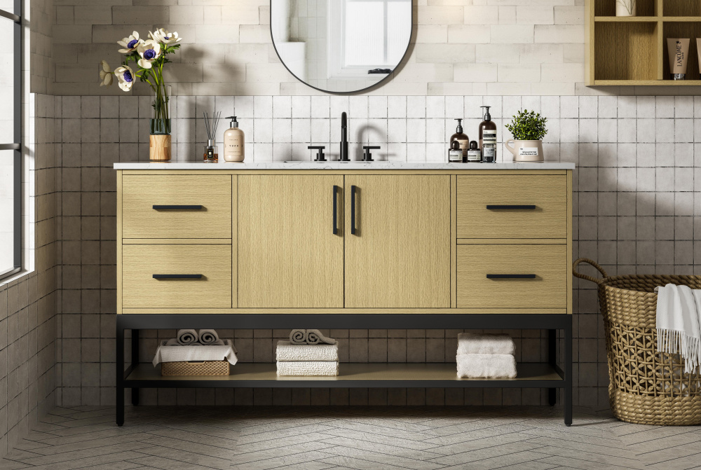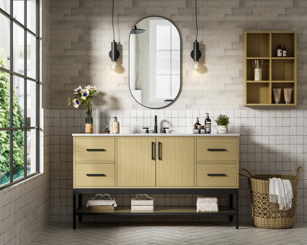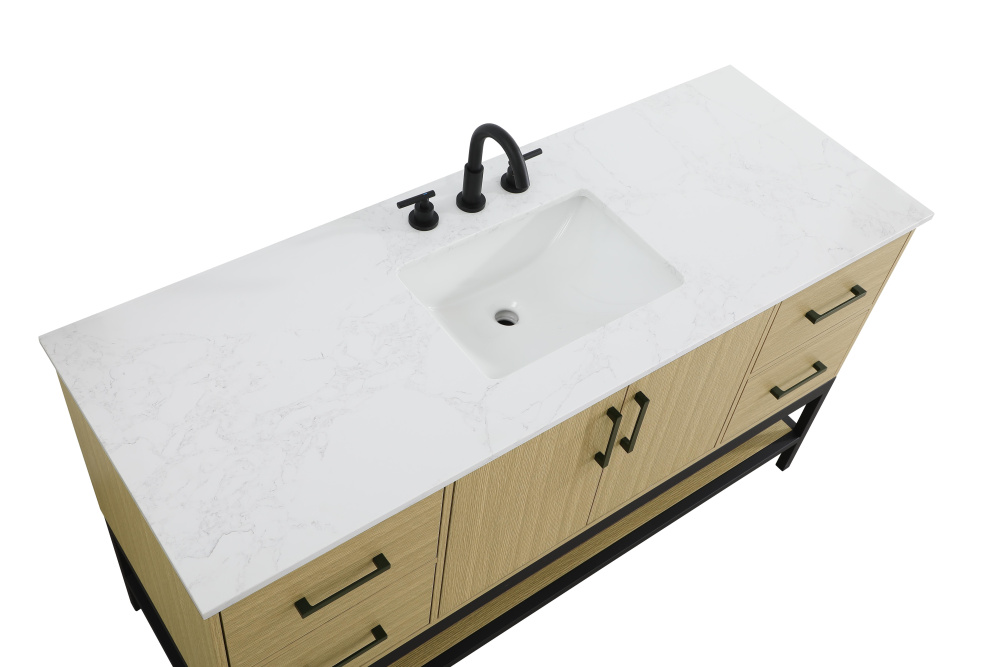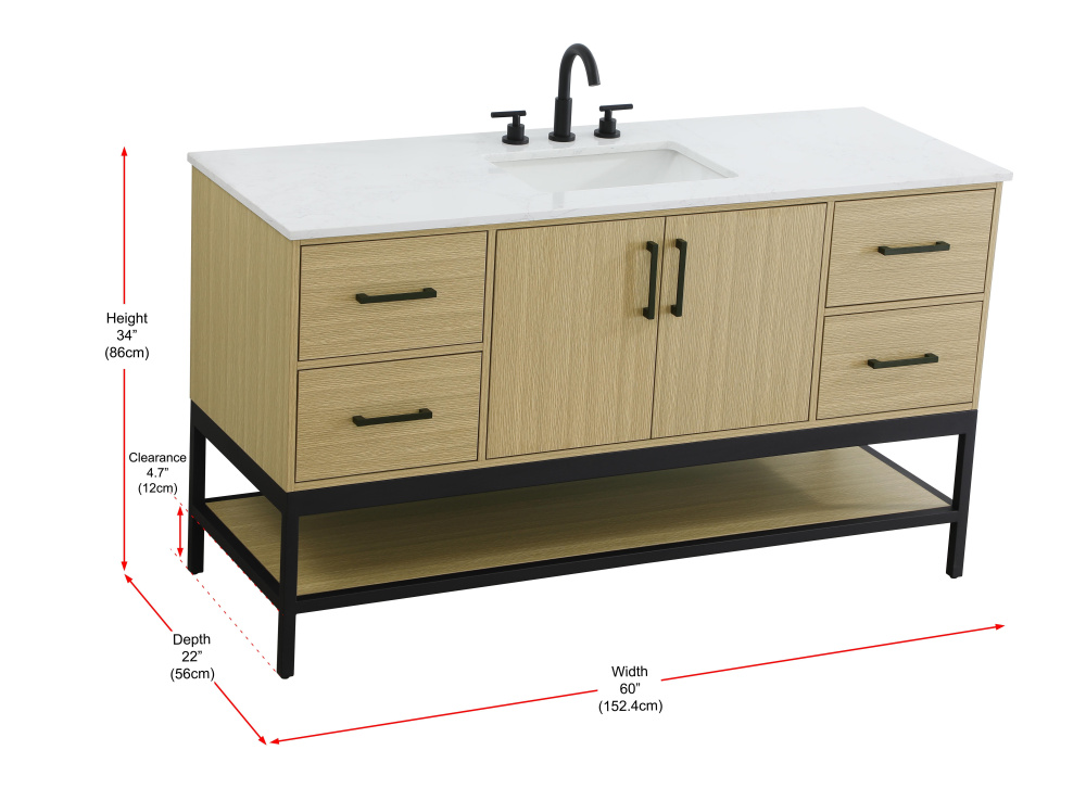 Upgrade your bathroom with this modern bathroom vanity that combines form and function effortlessly. Its sleek wood veneer cabinetry, paired with a bold black metal frame, brings a clean, contemporary vibe to any space. Designed with practicality in mind, this vanity offers soft-close drawers and cabinets to organize your essentials, as well as an open lower shelf for added storage or display. The durable white quartz countertop is built to withstand daily use, while the undermount ceramic sink ensures easy maintenance. Complete with matte black hardware and pre-drilled features for effortless installation, this vanity is the perfect centerpiece to refresh your bathroom with style and efficiency.
