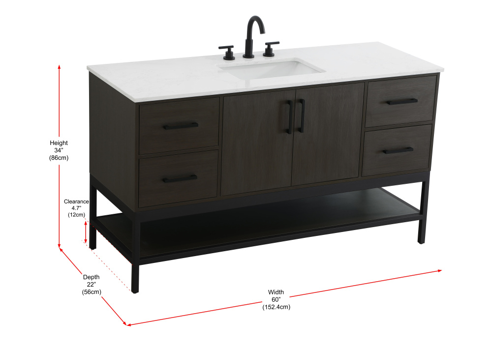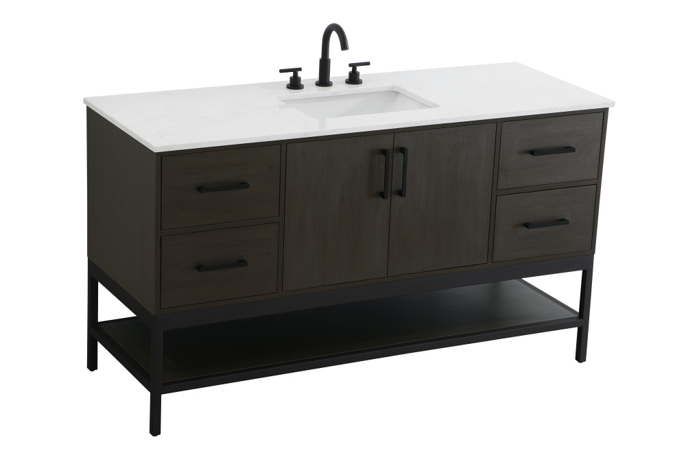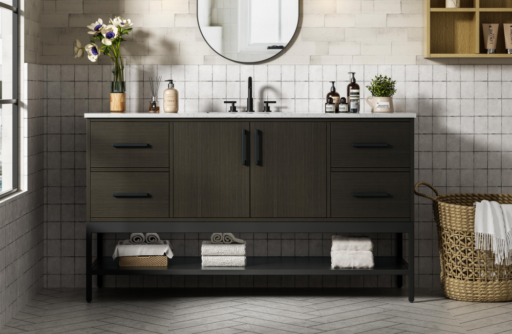 Upgrade your bathroom with this modern bathroom vanity that combines form and function effortlessly. Its sleek wood veneer cabinetry, paired with a bold black metal frame, brings a clean, contemporary vibe to any space. Designed with practicality in mind, this vanity offers soft-close drawers and cabinets to organize your essentials, as well as an open lower shelf for added storage or display. The durable white quartz countertop is built to withstand daily use, while the undermount ceramic sink ensures easy maintenance. Complete with matte black hardware and pre-drilled features for effortless installation, this vanity is the perfect centerpiece to refresh your bathroom with style and efficiency.