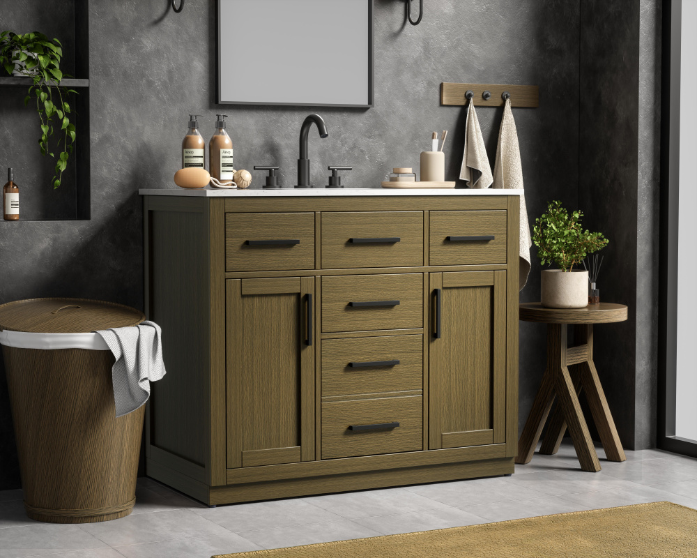 Perfectly suited for transitional and contemporary bathroom designs, this vanity seamlessly blends rustic and modern elements while being crafted from solid wood and MDF for exceptional durability and strength.