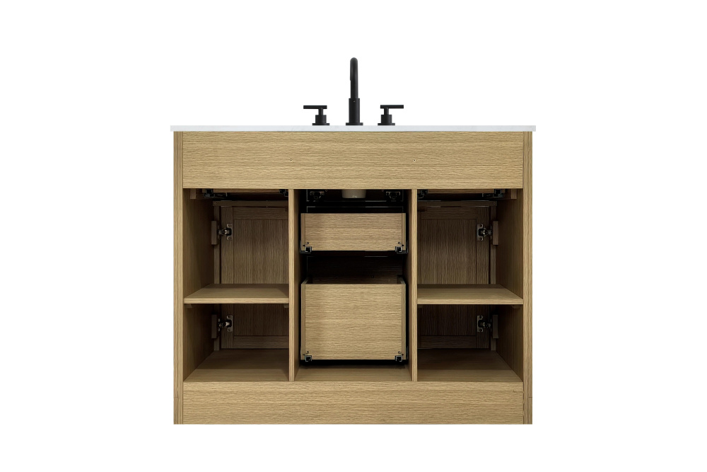 Perfectly suited for transitional and contemporary bathroom designs, this vanity seamlessly blends rustic and modern elements while being crafted from solid wood and MDF for exceptional durability and strength.
