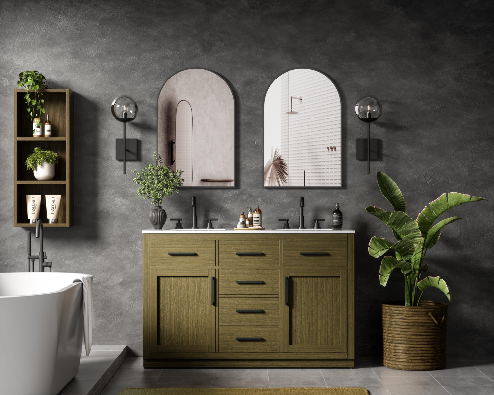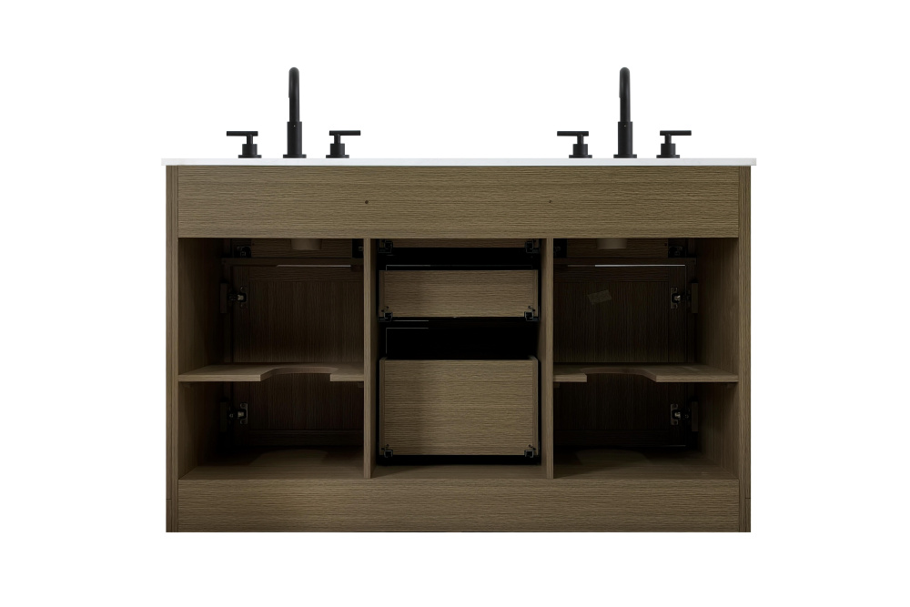 Perfectly suited for transitional and contemporary bathroom designs, this vanity seamlessly blends rustic and modern elements while being crafted from solid wood and MDF for exceptional durability and strength.