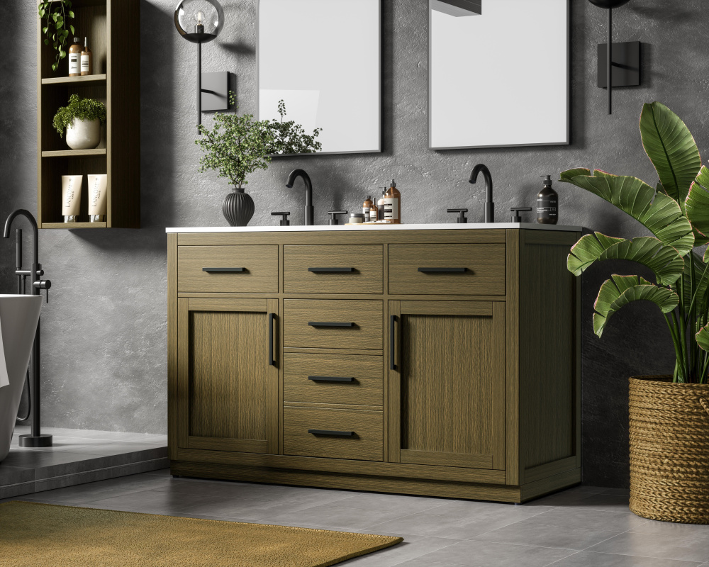 Introduce a perfect balance of functionality and style to your bathroom with this thoughtfully designed vanity. Constructed with a combination of solid wood and MDF, it offers durability and a sturdy build. The sleek engineered marble countertop with subtle grey marbling complements the rustic wood grain finish, creating a stylish and inviting centerpiece for your bathroom. Designed in a contemporary style with a transitional flair, it features a U-shaped shelf for seamless plumbing integration and multiple soft-close drawers for clutter-free organization. A pull-down drawer enhances convenience, while the toe kick adds a refined, clean-lined appearance and simplifies cleaning underneath. Matte black hardware contrasts beautifully with the cabinet finish, tying the look together. Delivered fully assembled and equipped with foot levelers, this vanity combines practicality and aesthetic appeal to suit modern and transitional bathrooms alike.