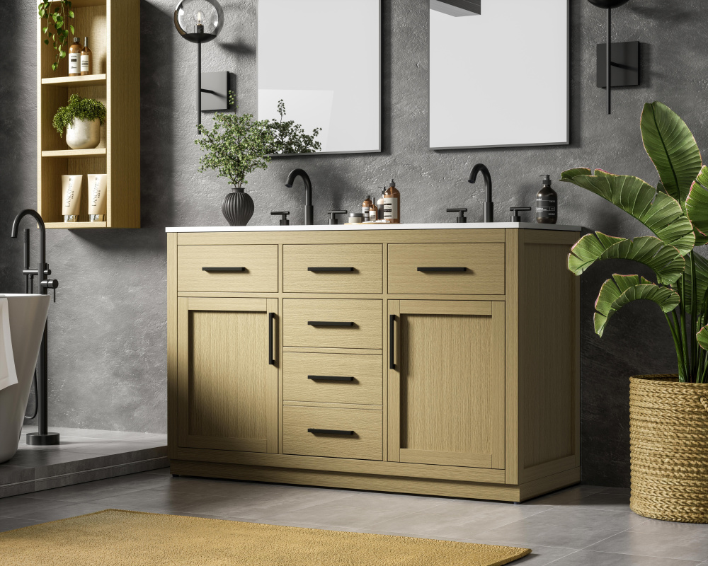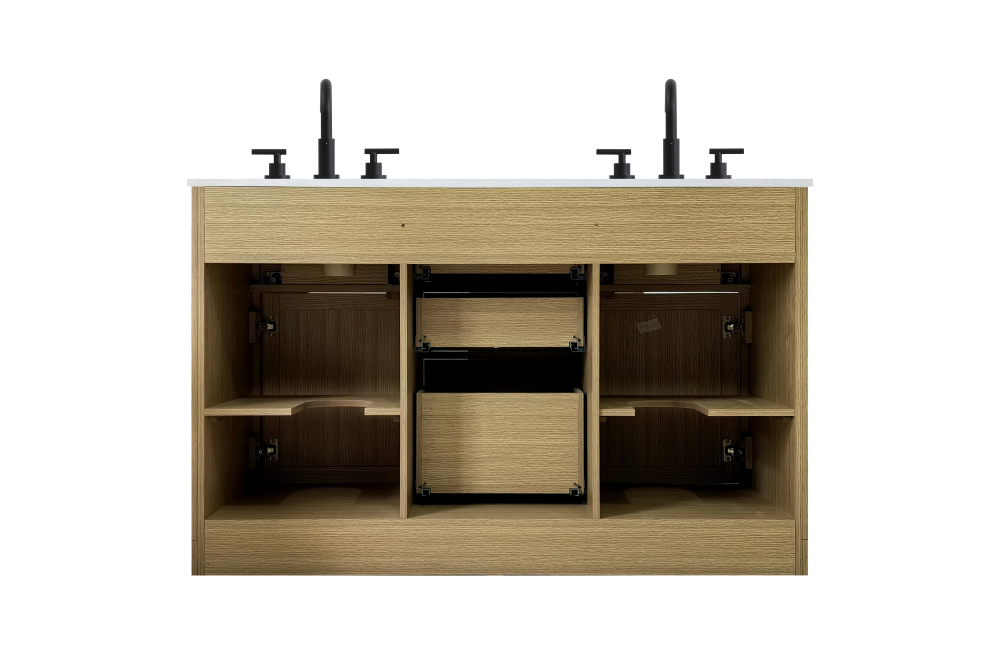 Perfectly suited for transitional and contemporary bathroom designs, this vanity seamlessly blends rustic and modern elements while being crafted from solid wood and MDF for exceptional durability and strength.