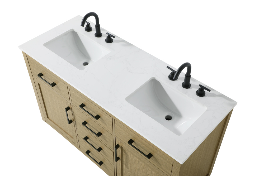 Introduce a perfect balance of functionality and style to your bathroom with this thoughtfully designed vanity. Constructed with a combination of solid wood and MDF, it offers durability and a sturdy build. The sleek engineered marble countertop with subtle grey marbling complements the rustic wood grain finish, creating a stylish and inviting centerpiece for your bathroom. Designed in a contemporary style with a transitional flair, it features a U-shaped shelf for seamless plumbing integration and multiple soft-close drawers for clutter-free organization. A pull-down drawer enhances convenience, while the toe kick adds a refined, clean-lined appearance and simplifies cleaning underneath. Matte black hardware contrasts beautifully with the cabinet finish, tying the look together. Delivered fully assembled and equipped with foot levelers, this vanity combines practicality and aesthetic appeal to suit modern and transitional bathrooms alike.
