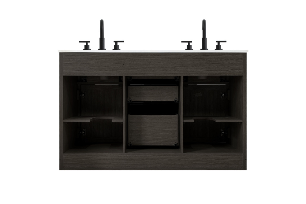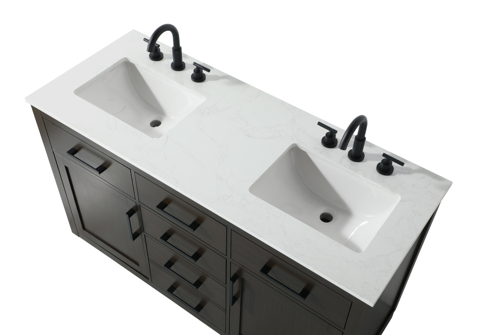Introduce a perfect balance of functionality and style to your bathroom with this thoughtfully designed vanity. Constructed with a combination of solid wood and MDF, it offers durability and a sturdy build. The sleek engineered marble countertop with subtle grey marbling complements the rustic wood grain finish, creating a stylish and inviting centerpiece for your bathroom. Designed in a contemporary style with a transitional flair, it features a U-shaped shelf for seamless plumbing integration and multiple soft-close drawers for clutter-free organization. A pull-down drawer enhances convenience, while the toe kick adds a refined, clean-lined appearance and simplifies cleaning underneath. Matte black hardware contrasts beautifully with the cabinet finish, tying the look together. Delivered fully assembled and equipped with foot levelers, this vanity combines practicality and aesthetic appeal to suit modern and transitional bathrooms alike.