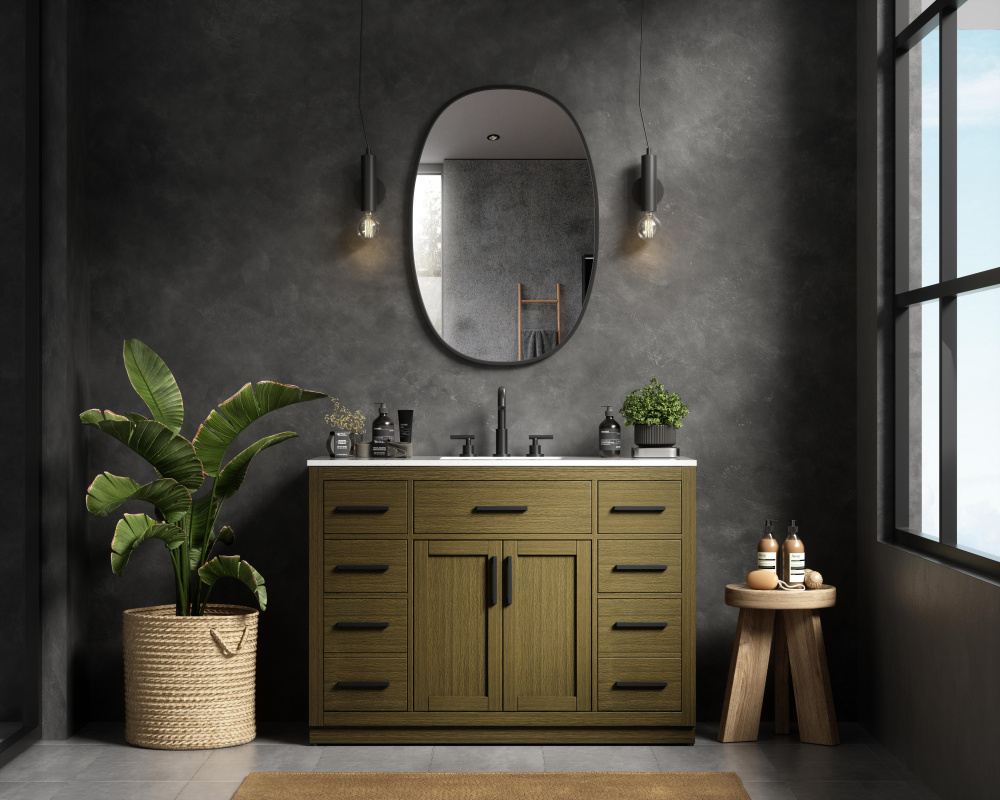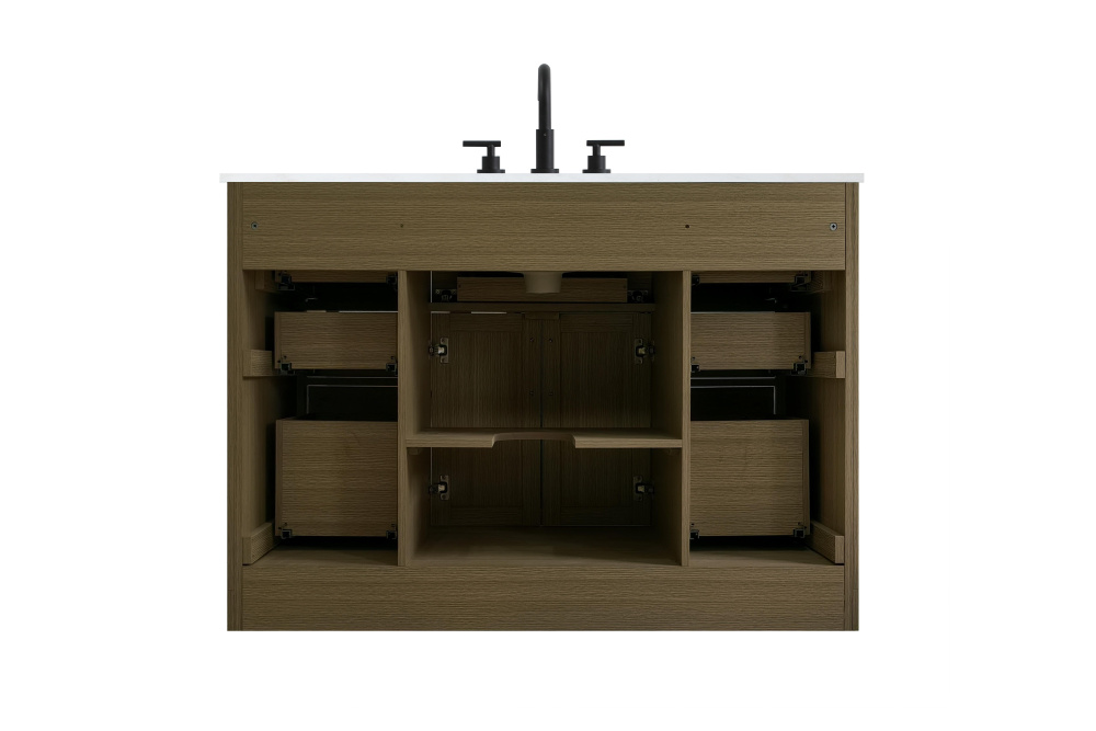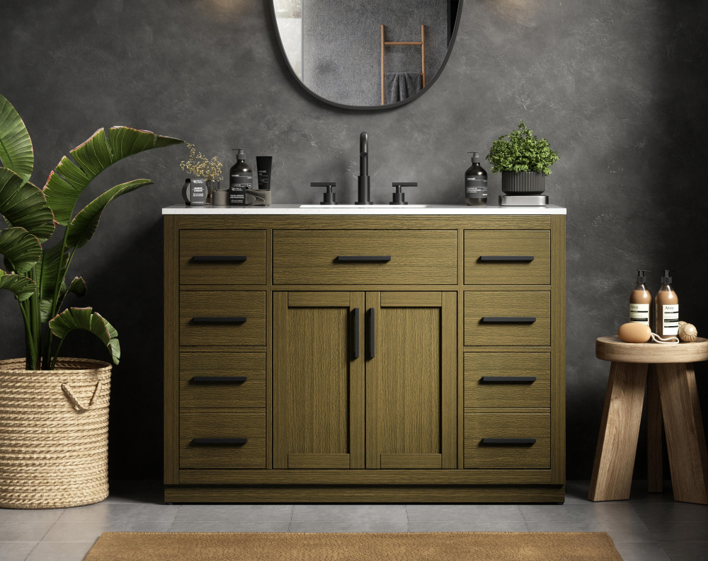 Perfectly suited for transitional and contemporary bathroom designs, this vanity seamlessly blends rustic and modern elements while being crafted from solid wood and MDF for exceptional durability and strength.