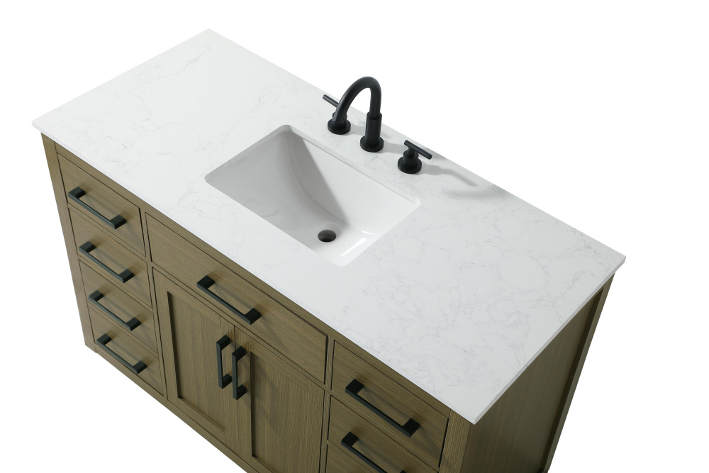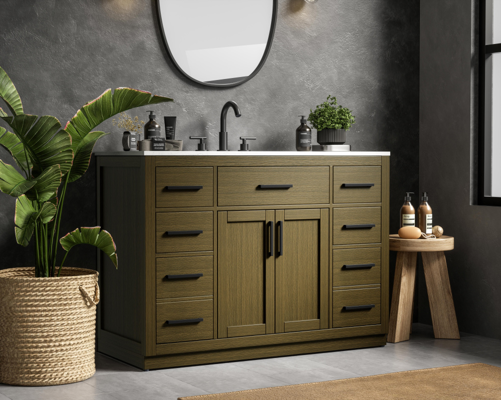 Introduce a perfect balance of functionality and style to your bathroom with this thoughtfully designed vanity. Constructed with a combination of solid wood and MDF, it offers durability and a sturdy build. The sleek engineered marble countertop with subtle grey marbling complements the rustic wood grain finish, creating a stylish and inviting centerpiece for your bathroom. Designed in a contemporary style with a transitional flair, it features a U-shaped shelf for seamless plumbing integration and multiple soft-close drawers for clutter-free organization. A pull-down drawer enhances convenience, while the toe kick adds a refined, clean-lined appearance and simplifies cleaning underneath. Matte black hardware contrasts beautifully with the cabinet finish, tying the look together. Delivered fully assembled and equipped with foot levelers, this vanity combines practicality and aesthetic appeal to suit modern and transitional bathrooms alike.