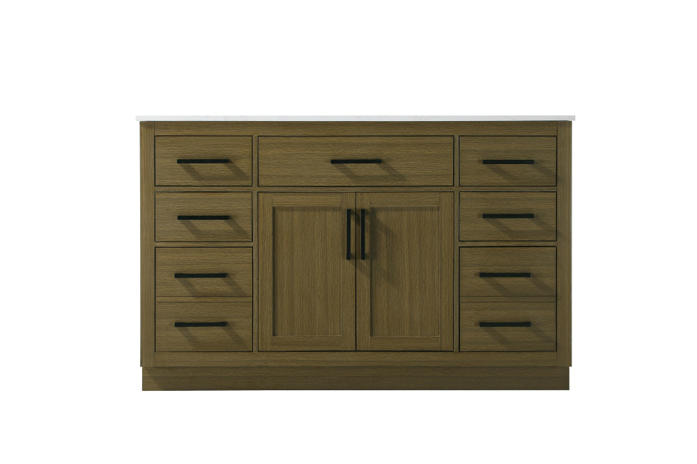 Introduce a perfect balance of functionality and style to your bathroom with this thoughtfully designed vanity. Constructed with a combination of solid wood and MDF, it offers durability and a sturdy build. The sleek engineered marble countertop with subtle grey marbling complements the rustic wood grain finish, creating a stylish and inviting centerpiece for your bathroom. Designed in a contemporary style with a transitional flair, it features a U-shaped shelf for seamless plumbing integration and multiple soft-close drawers for clutter-free organization. A pull-down drawer enhances convenience, while the toe kick adds a refined, clean-lined appearance and simplifies cleaning underneath. Matte black hardware contrasts beautifully with the cabinet finish, tying the look together. Delivered fully assembled and equipped with foot levelers, this vanity combines practicality and aesthetic appeal to suit modern and transitional bathrooms alike.
