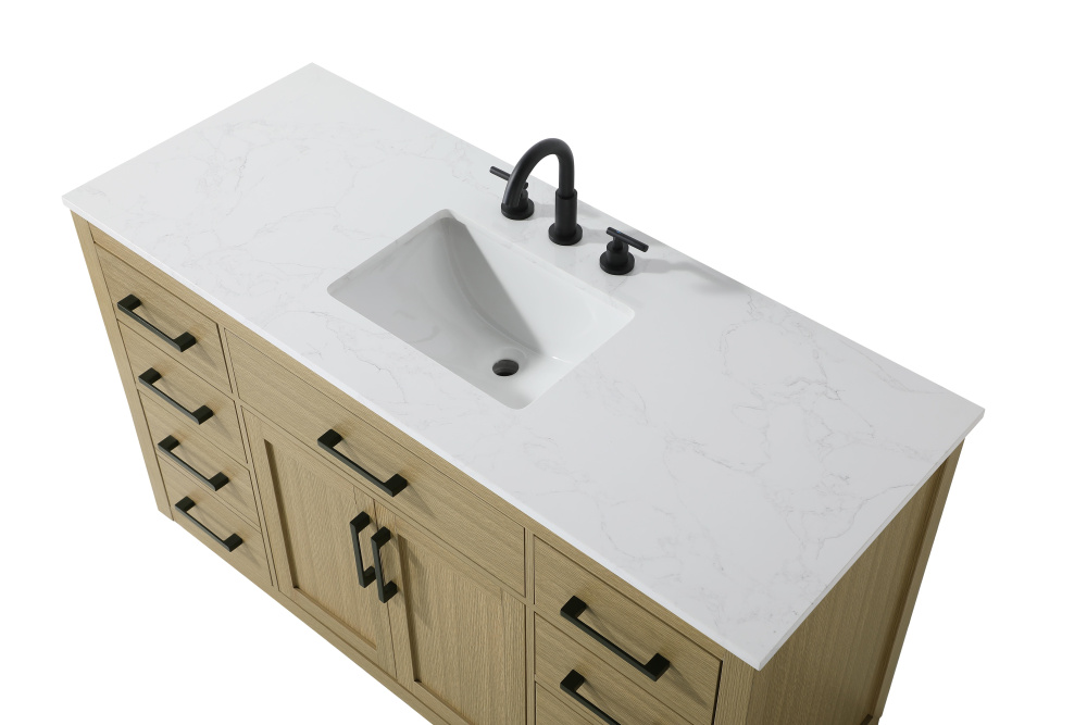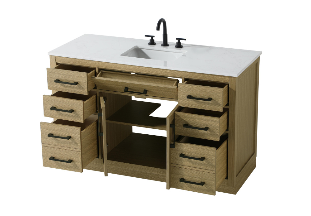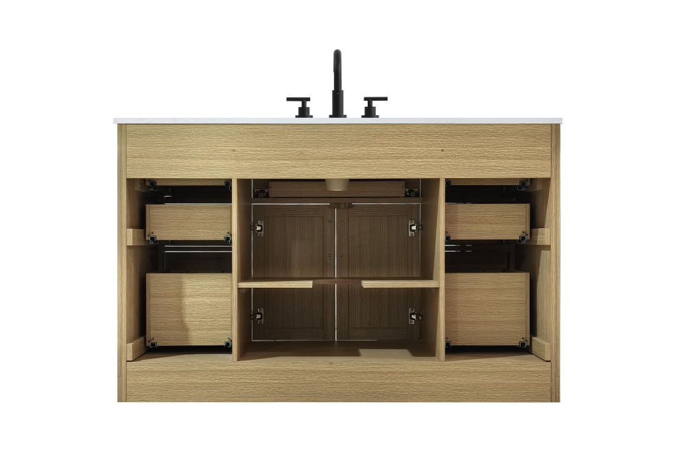 Introduce a perfect balance of functionality and style to your bathroom with this thoughtfully designed vanity. Constructed with a combination of solid wood and MDF, it offers durability and a sturdy build. The sleek engineered marble countertop with subtle grey marbling complements the rustic wood grain finish, creating a stylish and inviting centerpiece for your bathroom. Designed in a contemporary style with a transitional flair, it features a U-shaped shelf for seamless plumbing integration and multiple soft-close drawers for clutter-free organization. A pull-down drawer enhances convenience, while the toe kick adds a refined, clean-lined appearance and simplifies cleaning underneath. Matte black hardware contrasts beautifully with the cabinet finish, tying the look together. Delivered fully assembled and equipped with foot levelers, this vanity combines practicality and aesthetic appeal to suit modern and transitional bathrooms alike.