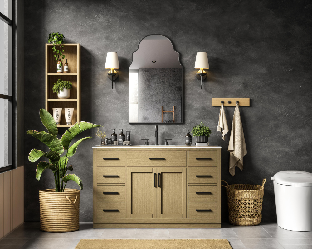Perfectly suited for transitional and contemporary bathroom designs, this vanity seamlessly blends rustic and modern elements while being crafted from solid wood and MDF for exceptional durability and strength.