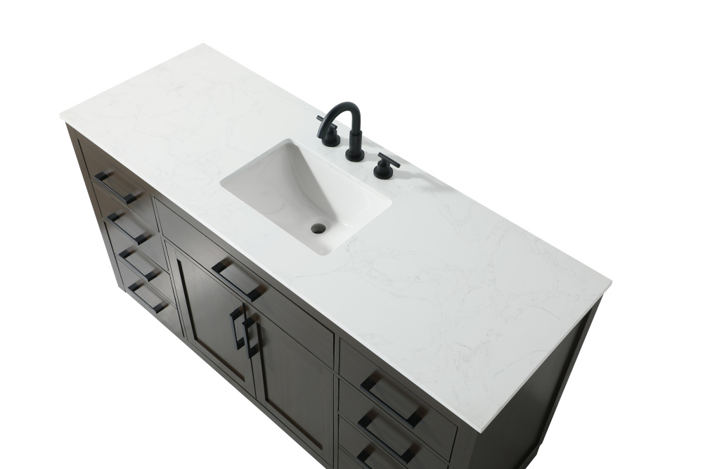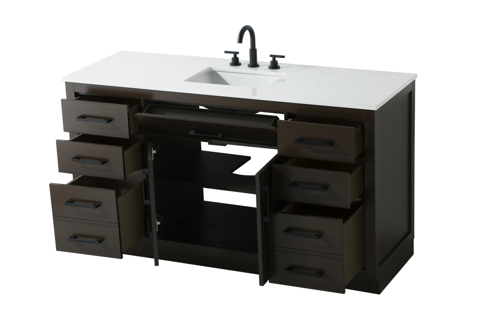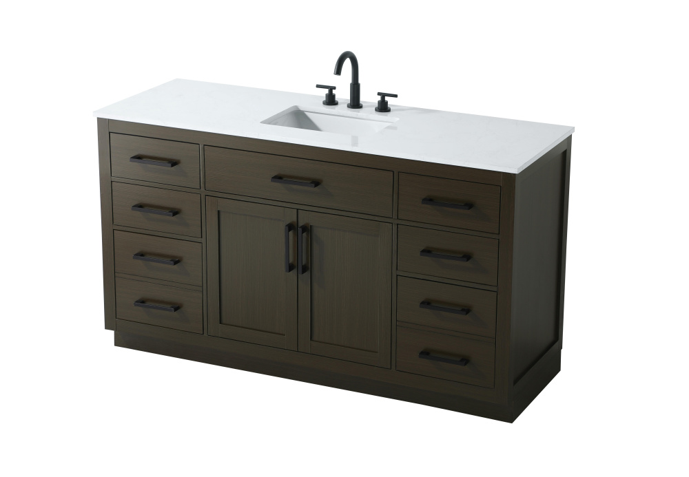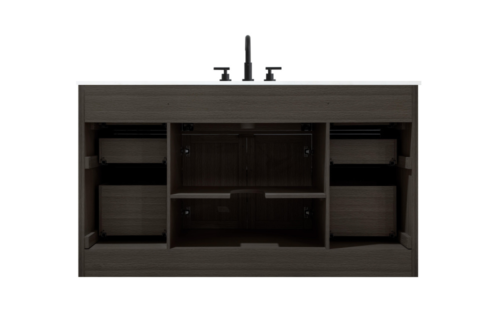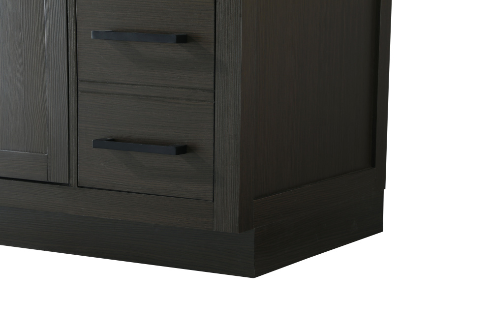 Introduce a perfect balance of functionality and style to your bathroom with this thoughtfully designed vanity. Constructed with a combination of solid wood and MDF, it offers durability and a sturdy build. The sleek engineered marble countertop with subtle grey marbling complements the rustic wood grain finish, creating a stylish and inviting centerpiece for your bathroom. Designed in a contemporary style with a transitional flair, it features a U-shaped shelf for seamless plumbing integration and multiple soft-close drawers for clutter-free organization. A pull-down drawer enhances convenience, while the toe kick adds a refined, clean-lined appearance and simplifies cleaning underneath. Matte black hardware contrasts beautifully with the cabinet finish, tying the look together. Delivered fully assembled and equipped with foot levelers, this vanity combines practicality and aesthetic appeal to suit modern and transitional bathrooms alike.