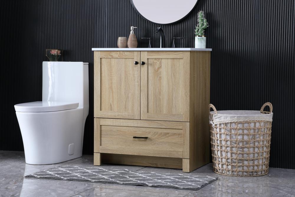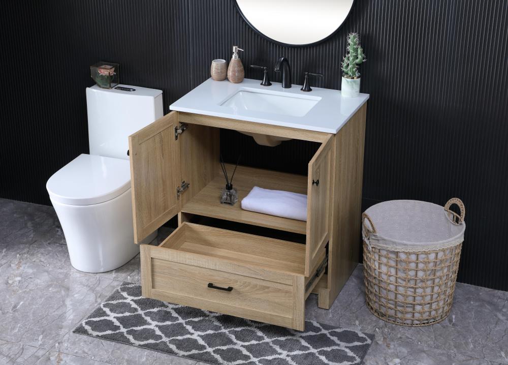 Revel in the beauty of a vanity that mimics the charm of real wood without the maintenance, boasting a faux wood look that adds a touch of natural warmth and rustic sophistication to your bathroom.