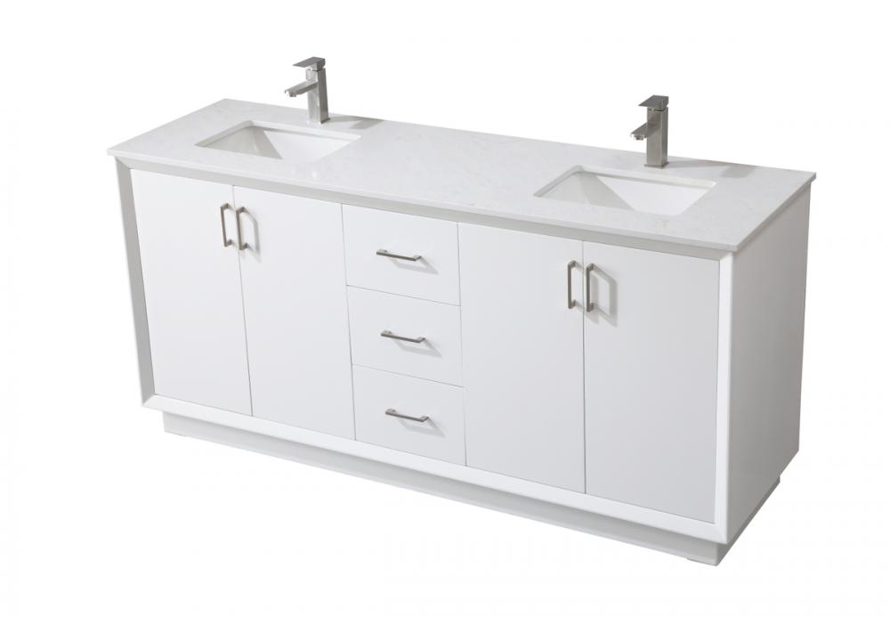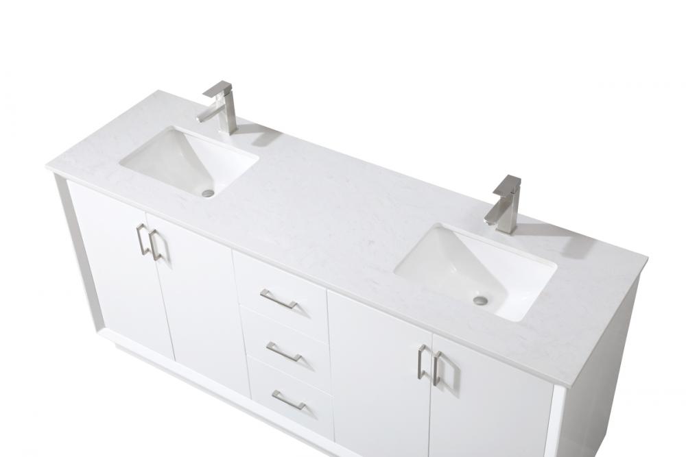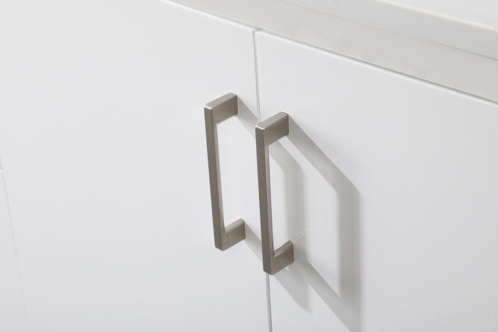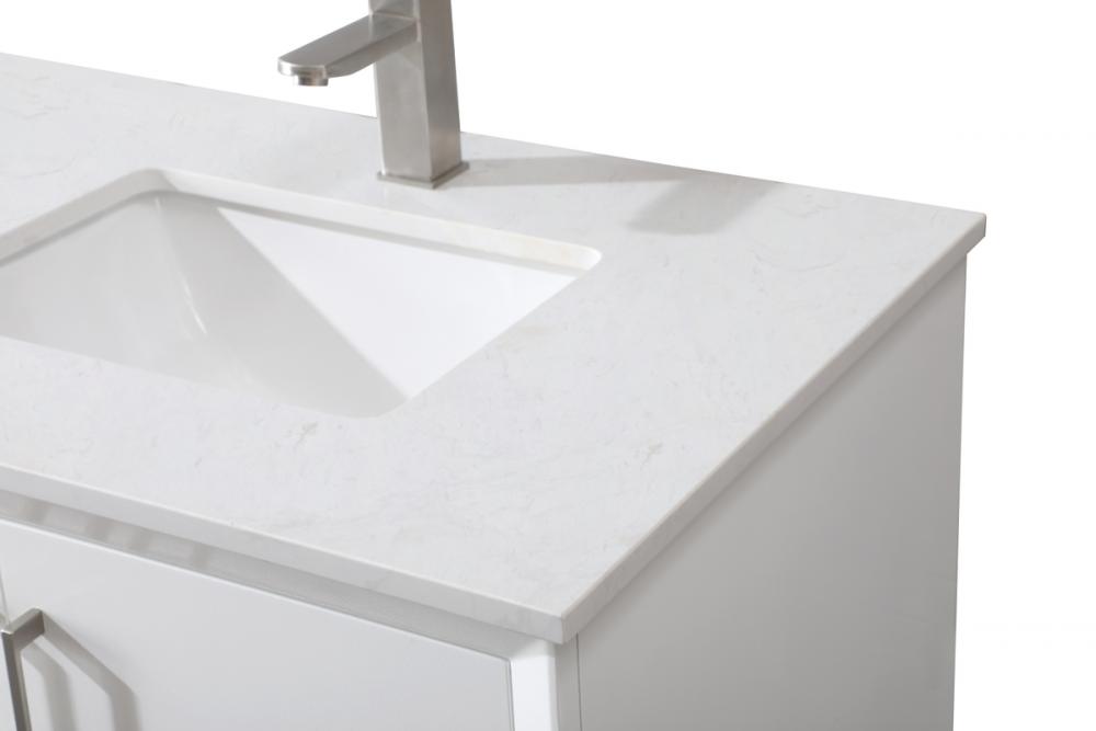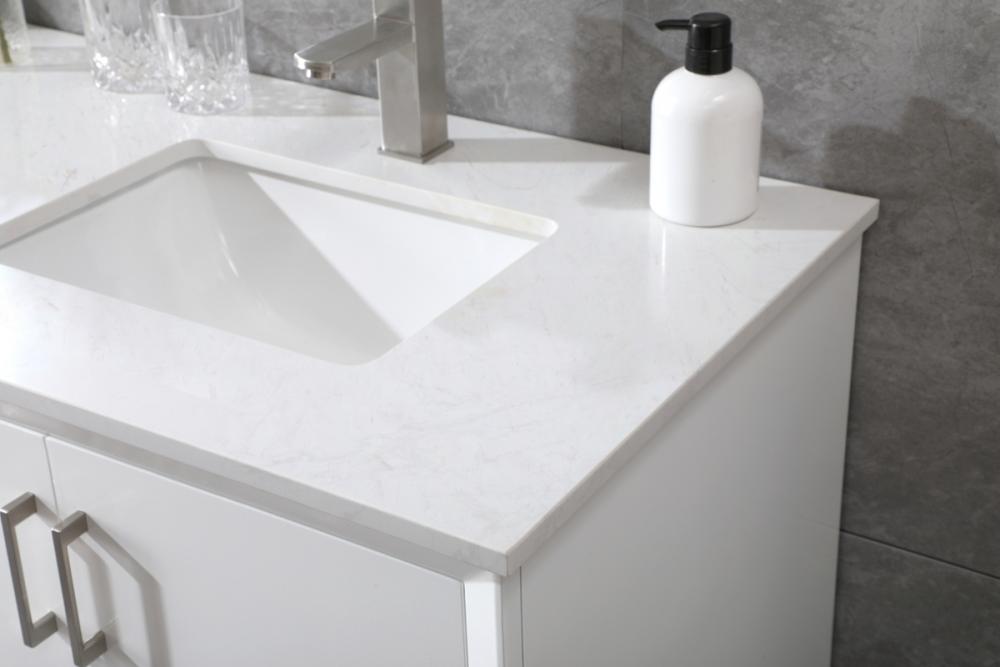 Experience luxury with a 0.75-inch thick engineered marble countertop featuring a calacatta design with light grey veining, seamlessly blending durability with timeless elegance.