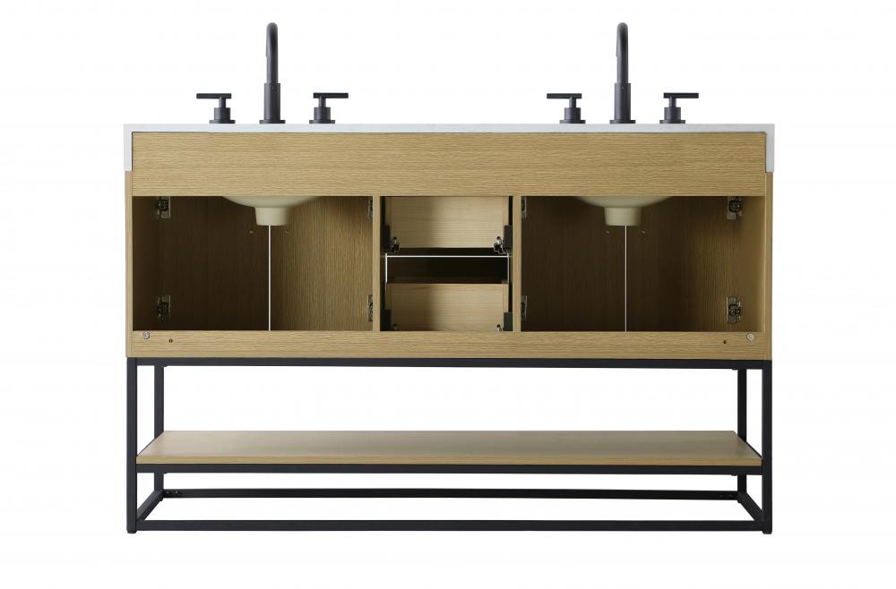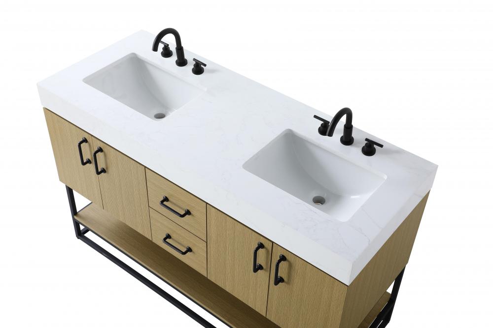 Upgrade your bathroom with this stylish transitional vanity, available in five stunning finishes, from crisp white to warm honey brown, designed to suit a variety of decor styles. The minimalist flat door panels and open wood shelf create a functional yet visually appealing storage solution, while the slender black metal legs elevate the look with modern sophistication. The 4-inch thick white engineered marble countertop, accented with natural veining, adds a luxurious touch, perfectly complemented by soft-closing doors with sleek black metal bar pulls. Thoughtful details like the concealed overflow, back panel cutout for plumbing, and 3 pre-drilled holes for an 8-inch faucet make installation easy and efficient. with a porcelain sink and farmhouse-inspired touches, this vanity brings both elegance and practicality to any bathroom setting.