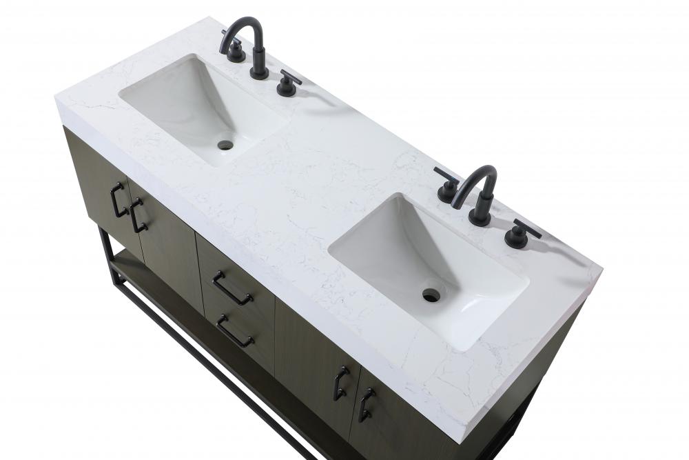 Topped with a thick, 4-inch white engineered marble countertop featuring natural veining, this vanity combines luxurious aesthetics with durability.