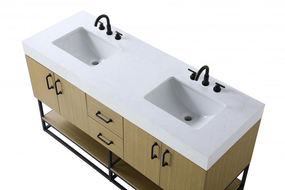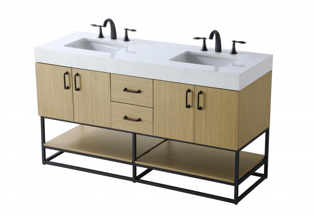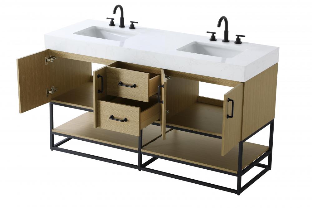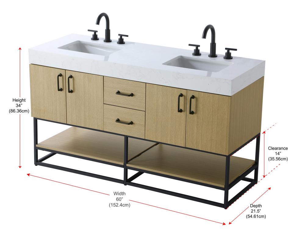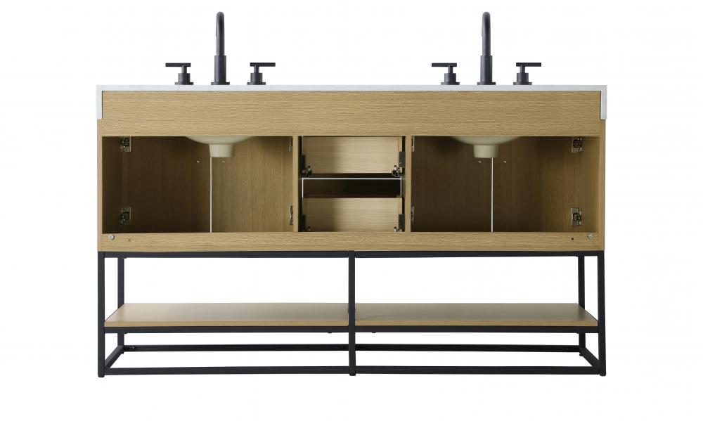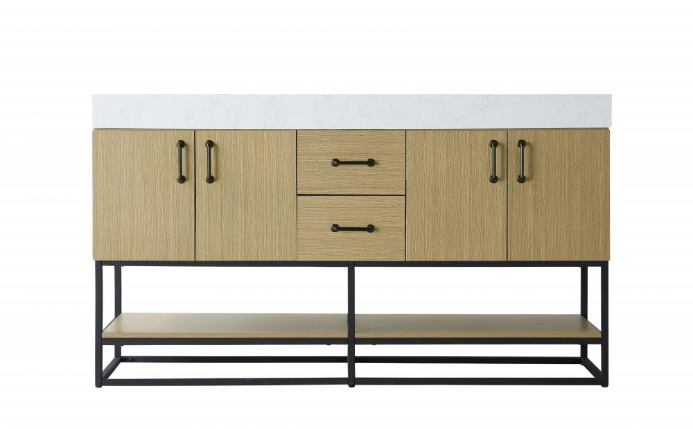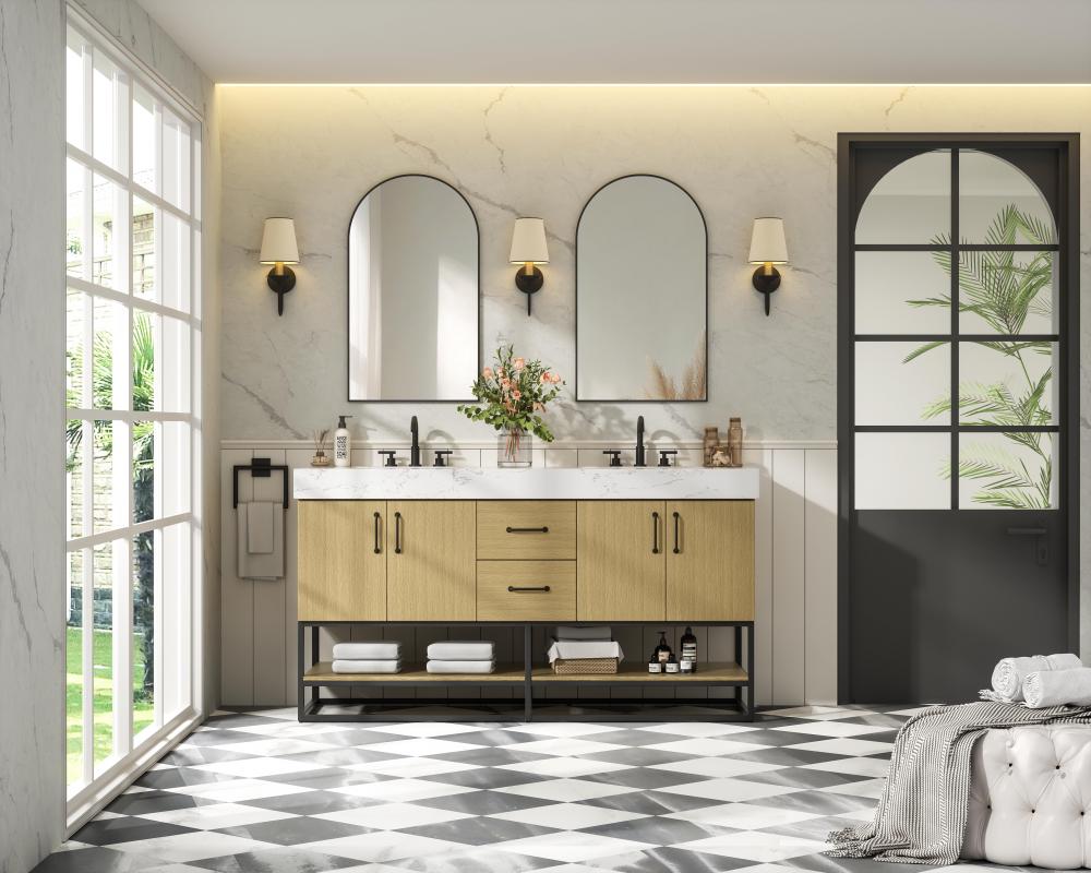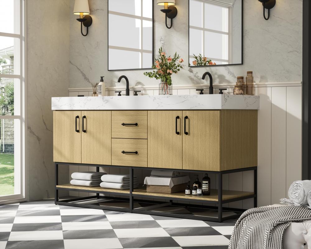Upgrade your bathroom with this stylish transitional vanity, available in five stunning finishes, from crisp white to warm honey brown, designed to suit a variety of decor styles. The minimalist flat door panels and open wood shelf create a functional yet visually appealing storage solution, while the slender black metal legs elevate the look with modern sophistication. The 4-inch thick white engineered marble countertop, accented with natural veining, adds a luxurious touch, perfectly complemented by soft-closing doors with sleek black metal bar pulls. Thoughtful details like the concealed overflow, back panel cutout for plumbing, and 3 pre-drilled holes for an 8-inch faucet make installation easy and efficient. with a porcelain sink and farmhouse-inspired touches, this vanity brings both elegance and practicality to any bathroom setting.