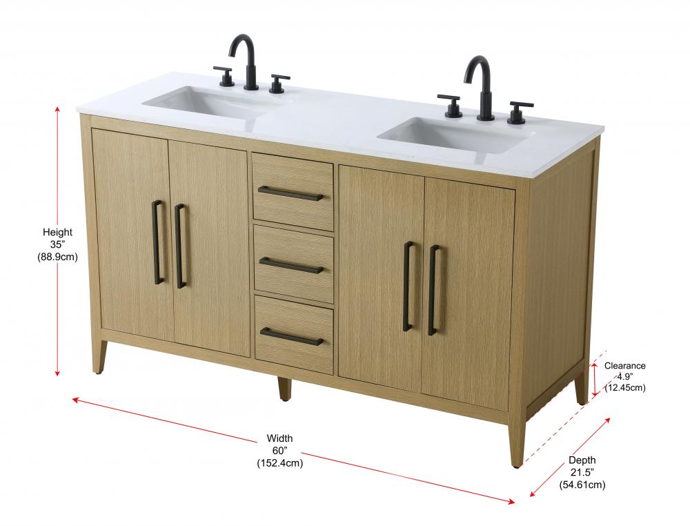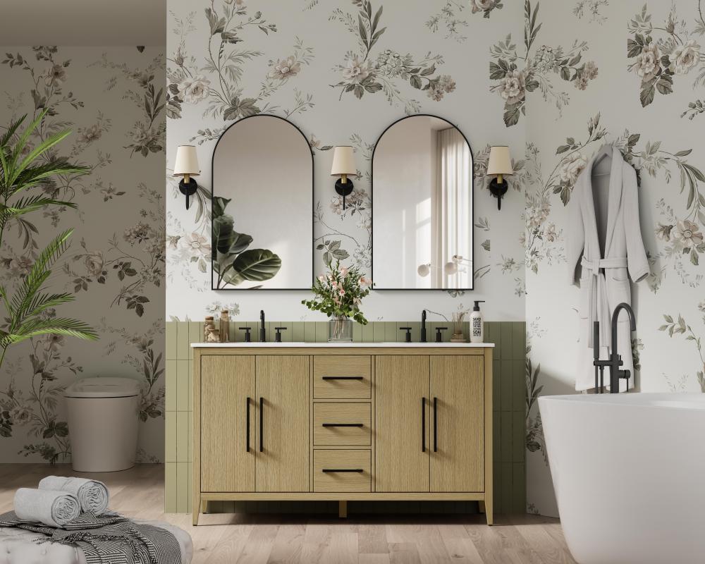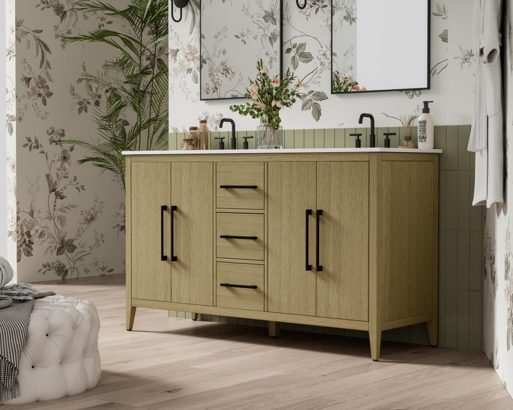 The vanity stands on tapered 5-inch solid wood legs with levelers for a balanced, polished look, combining modern style with practicality.