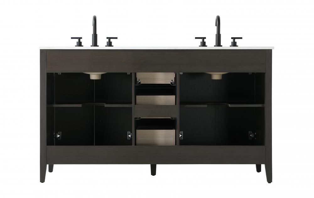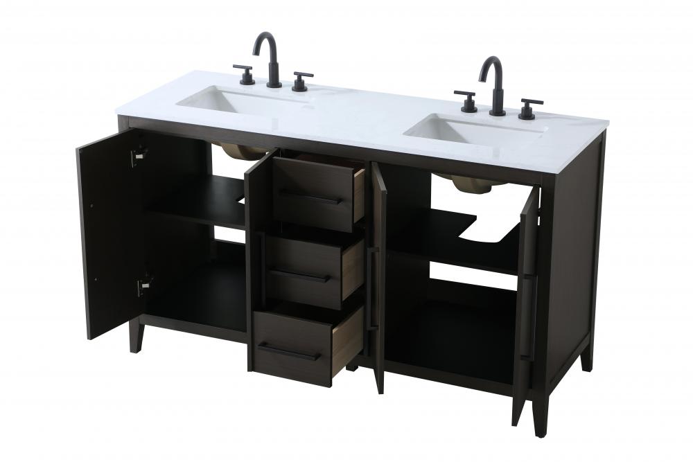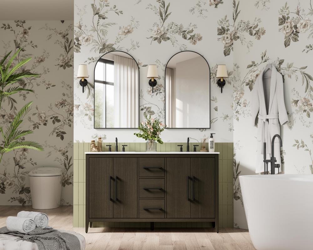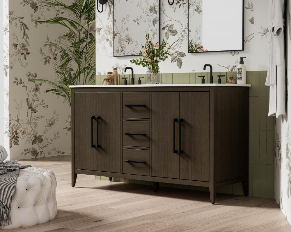 The vanity stands on tapered 5-inch solid wood legs with levelers for a balanced, polished look, combining modern style with practicality.