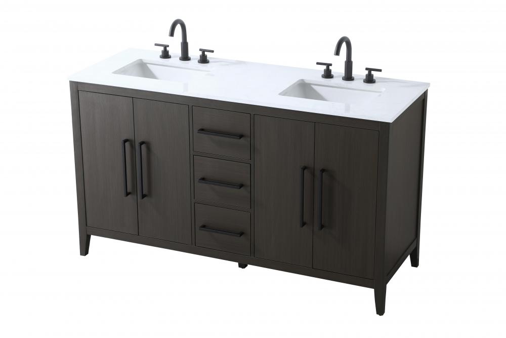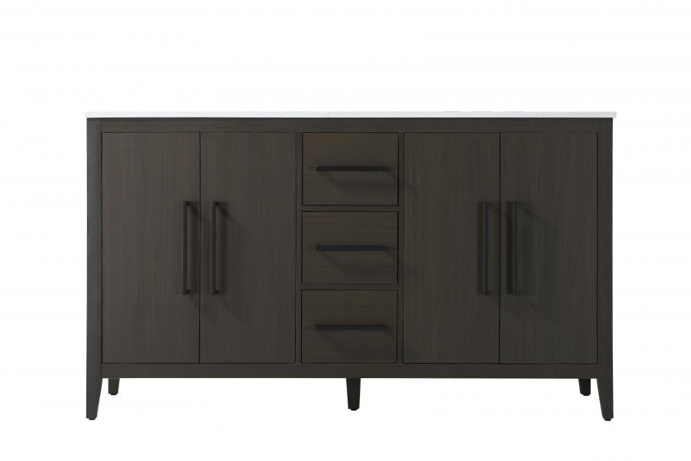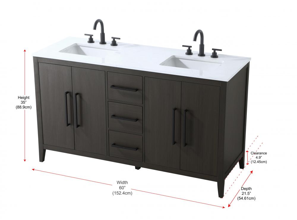 Bring both elegance and practicality to your bathroom with this transitional vanity, available in a selection of rich finishes that highlight the beauty of faux wood grain in shades of mocha, chestnut, and honey, along with classic white and modern grey. The flat door panels and sleek black metal pulls create a minimalist yet refined aesthetic, while the soft-closing drawers and tapered legs with levelers provide smooth, functional operation. Topped with a luxurious white engineered marble countertop and featuring a porcelain sink, this vanity combines timeless style with modern efficiency. Thoughtfully designed with U-shaped cutout for plumbing, it offers ample storage and easy installation, making it the perfect centerpiece for any bathroom.