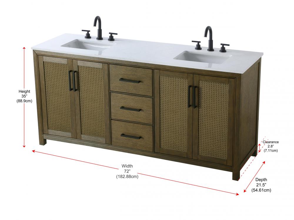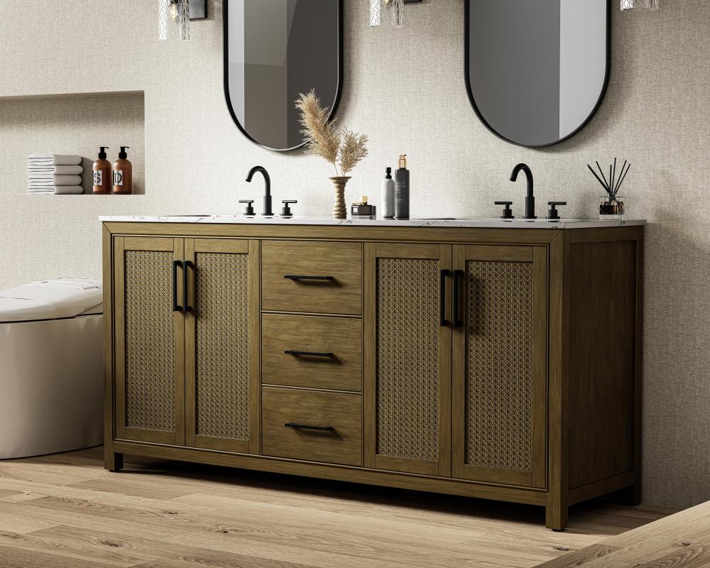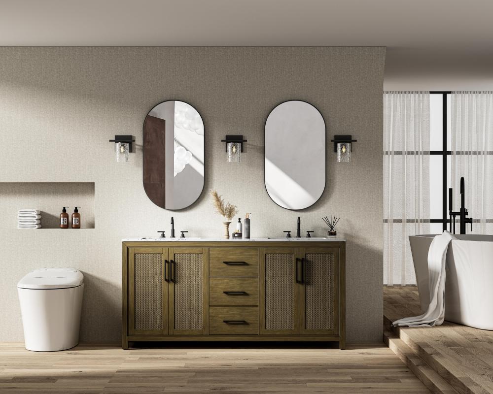 Perfect for those with an eye for detail and quality, this transitional vanity blends modern design with timeless elegance. Available in five stunning finishes, from Crisp White to Linen Oak, the wood grain visuals of the oak options bring warmth and character to any bathroom. The caning design on the Shaker-style door panels adds texture and a touch of refinement, while the soft-closing doors and drawers ensure smooth, quiet functionality. Topped with a white engineered marble countertop, the vanity offers both luxury and practicality, complete with pre-drilled faucet holes for customization. A concealed overflow and U-shaped shelf for plumbing make installation effortless, and the slender black metal pulls provide a sleek contrast.